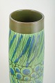Rare and monumental ceramic vase by Göran Andersson for Upsala-Ekeby, created in the 1960s. Cylindrical form with vivid hand-painted decoration in green and blue tones, featuring a distinctive band of concentric relief circles. A unique piece from the period – exceptional in both size and artistic expression.