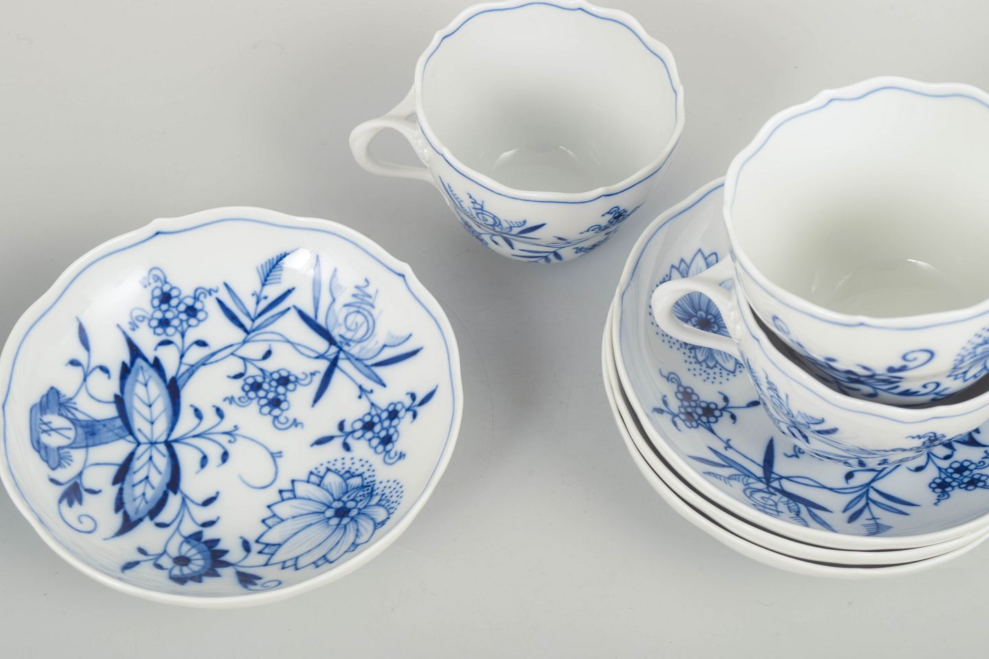 Set of four Meissen coffee cups with matching saucers in the classic Zwiebelmuster (Blue Onion) pattern.