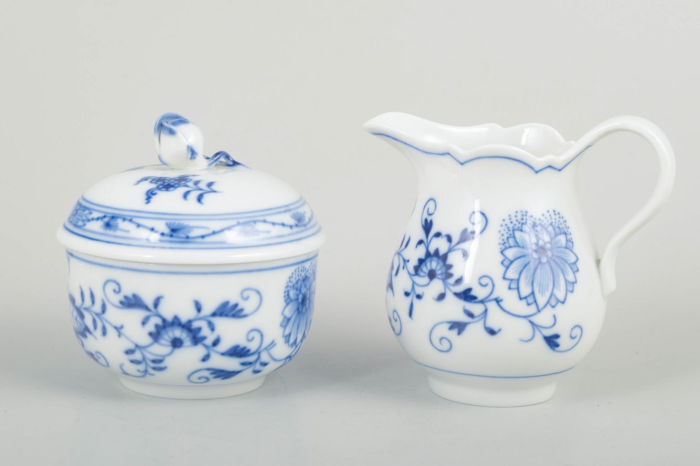 Meissen Blue Onion sugar bowl and creamer, mid-20th century.