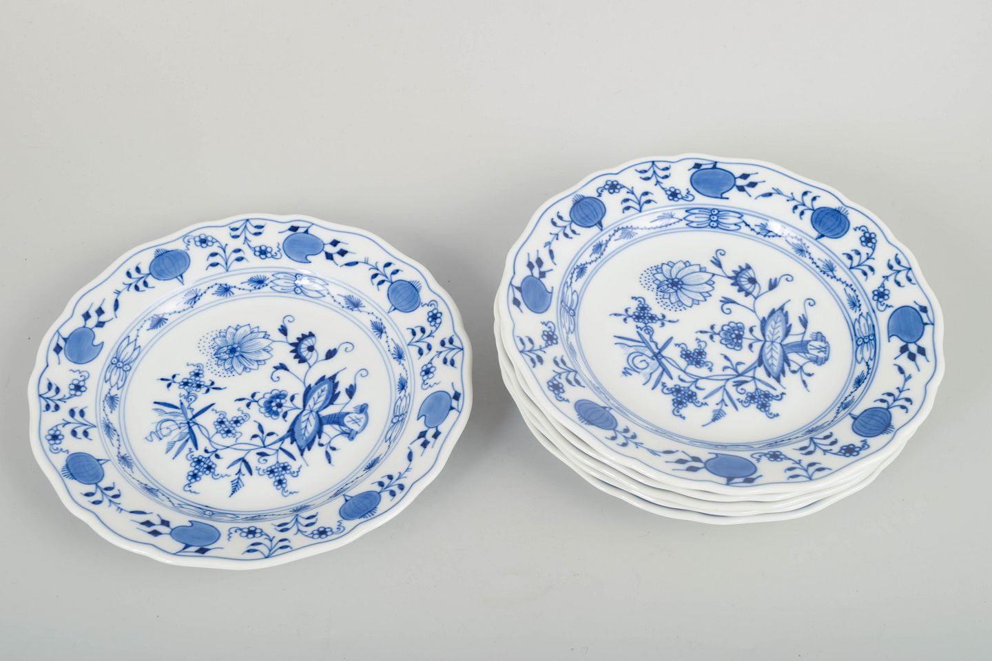 Sæt med seks Meissen-tallerkener i det klassiske løgmønstret (Zwiebelmuster), håndmalet i koboltblå underglasur og med let bølget kant.