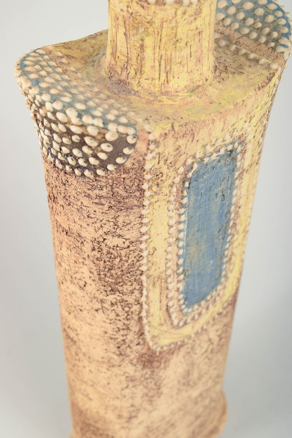 Høj, rektangulær studiovase i stentøj med kunstnerisk, mønsterdekoreret overflade i sand- og jordtoner samt indlagte blå og hvide detaljer. Skulpturel hals og karakterfuld håndbygget form.