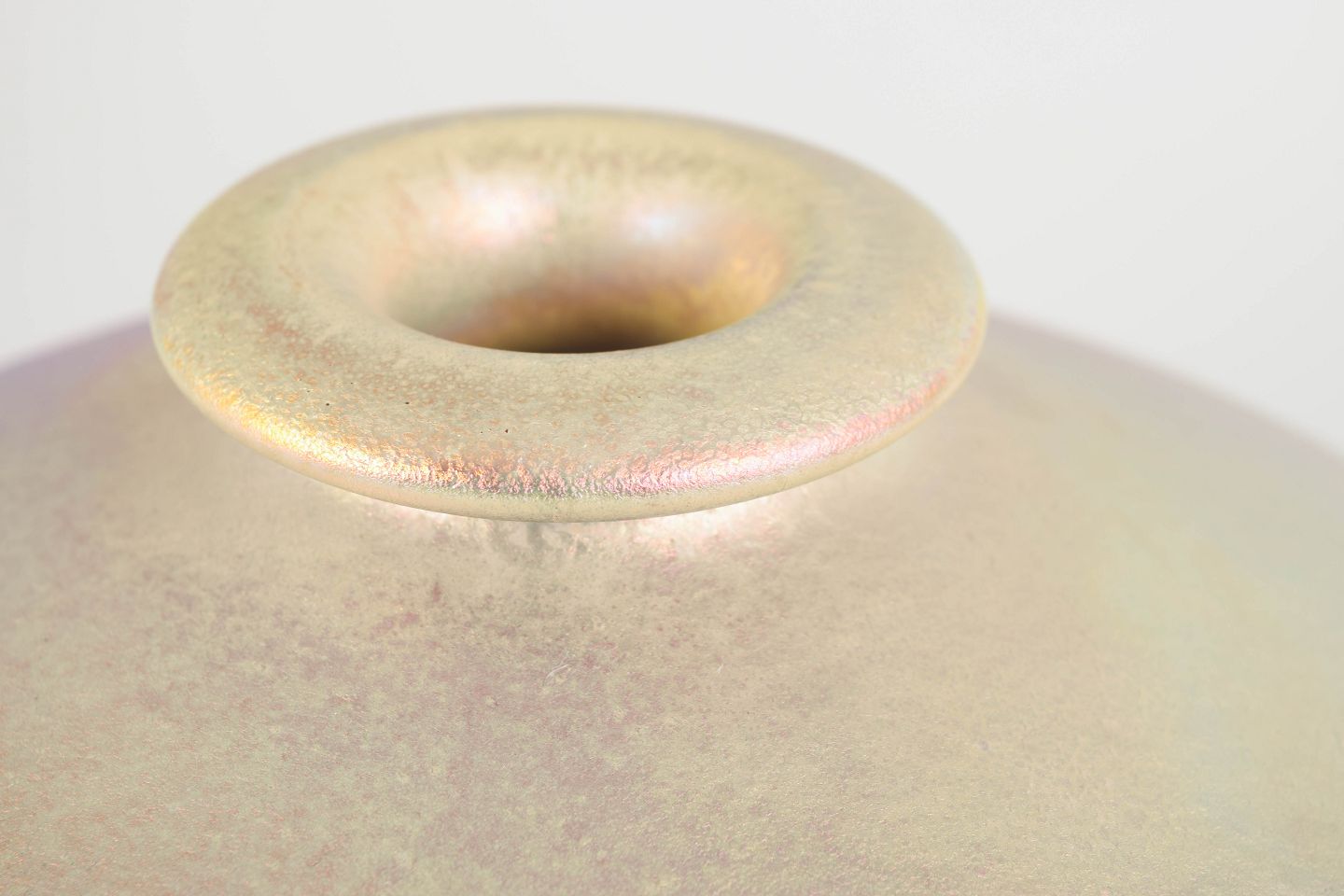 Håndlavet, monumentalt formet vase i keramik med iriserende, perlemorsskinnende overflade i bløde rosa- og guldtoner. Den sfæriske form og den lille, let markerede hals giver vasen en skulpturel og harmonisk fremtoning – karakteristisk for Mobachs håndværksmæssige tradition.