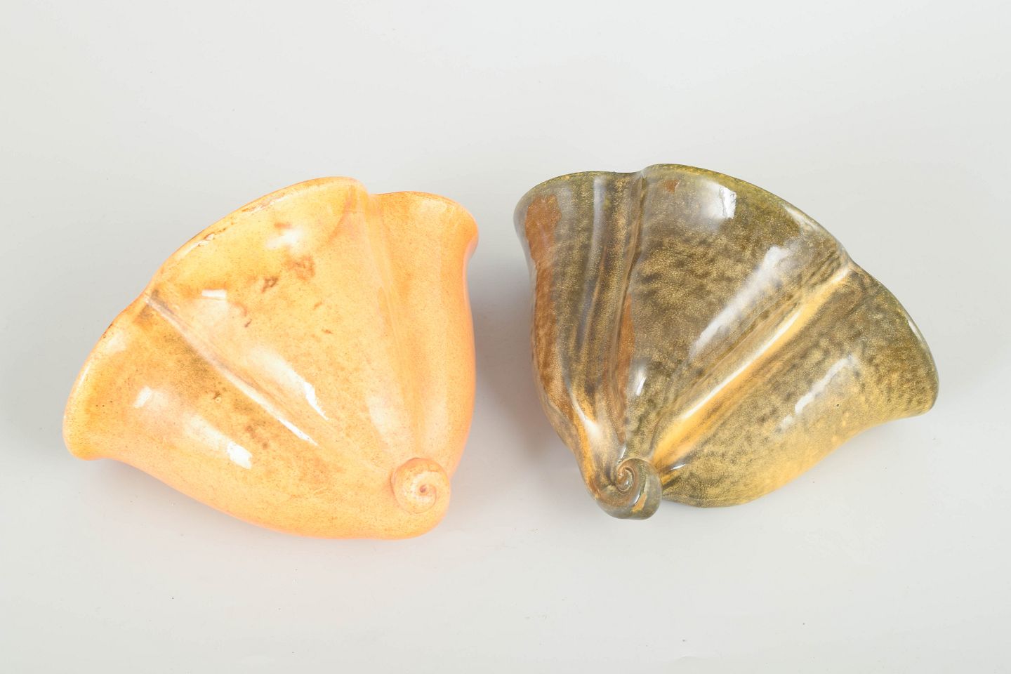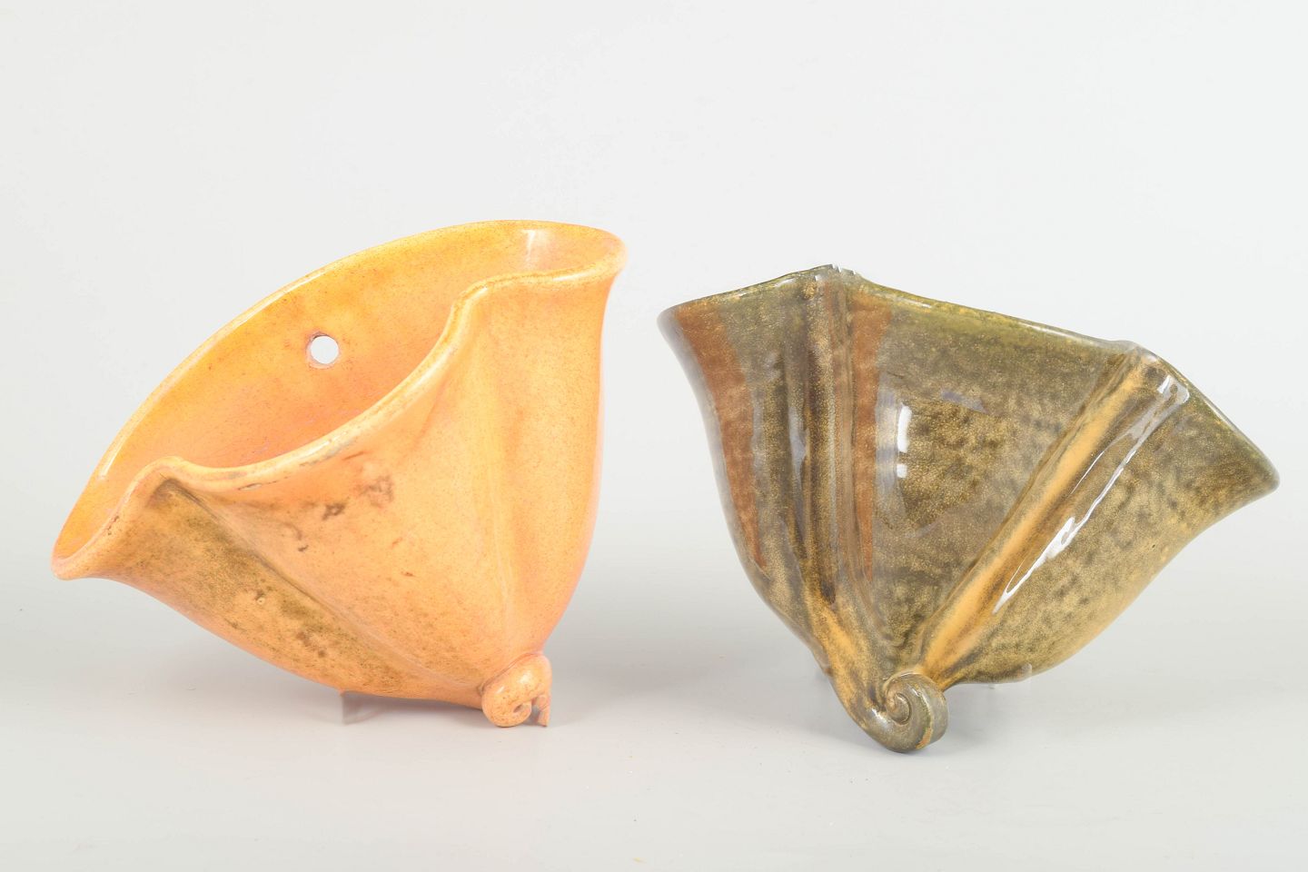 To dekorative væghængte urtepotter i formpresset keramik fra 1930’erne, udført i Kählers karakteristiske organiske formsprog. Den ene i varm orange-gul uran-glasur, den anden i brungrøn glasur med levende overfladespil. Begge med hul til ophæng.