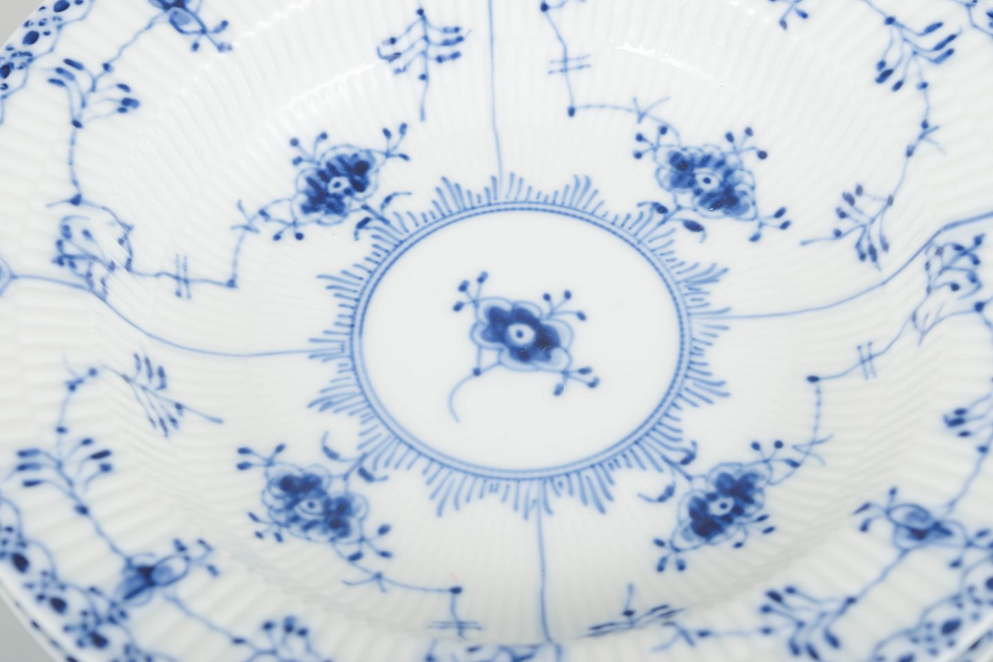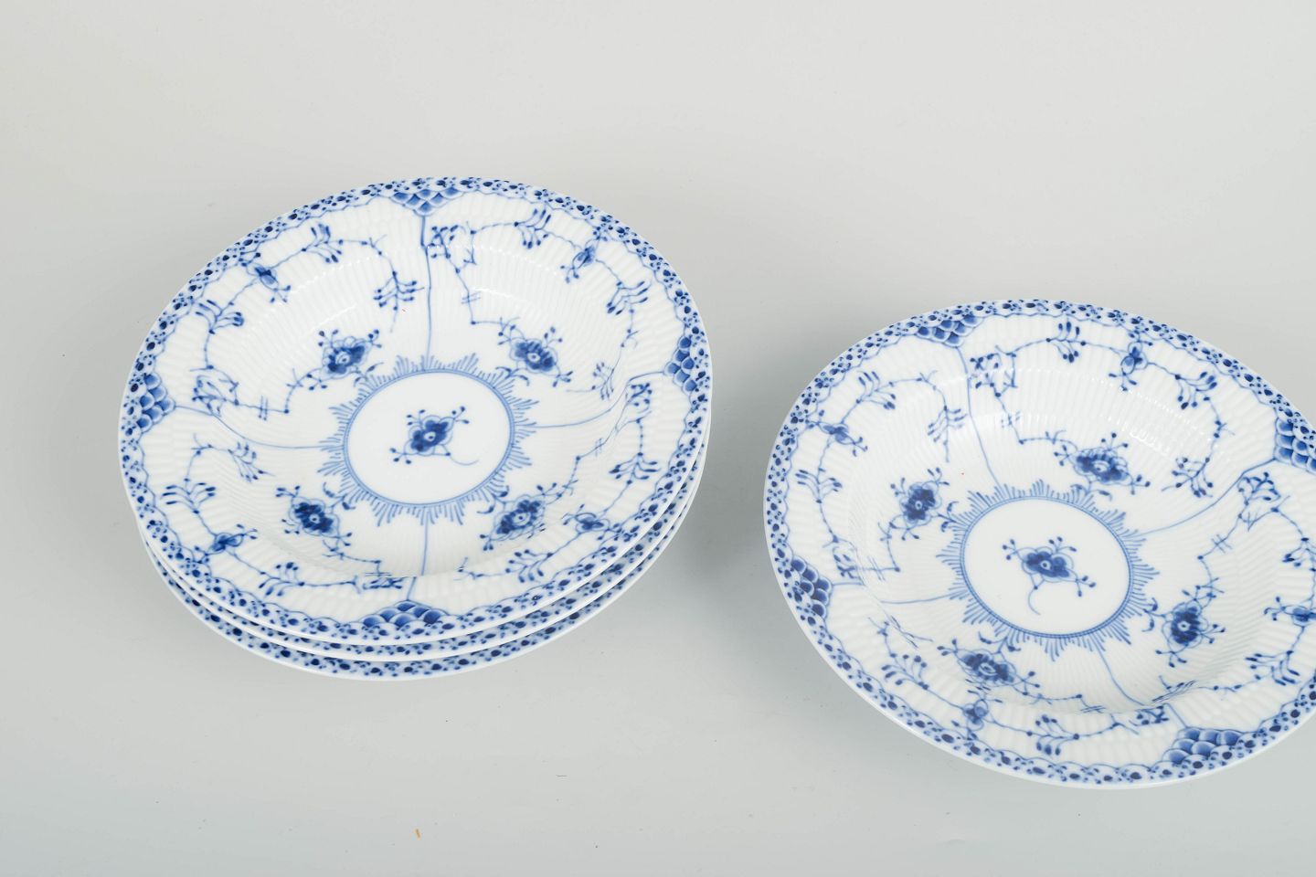 Fire elegante dybe tallerkener i Musselmalet Halvblonde. Dekoreret med håndmalet koboltblå ornamentik og den karakteristiske blondekant langs randen. Begge tallerkener er udført i riflet porcelæn og repræsenterer Royal Copenhagens klassiske kvalitet i sen 1900-tals produktion.