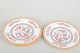 Set of four faience plates with colourful orientalist floral decoration in pink, blue and turquoise tones. Classic Cauldon design with gilt rim.