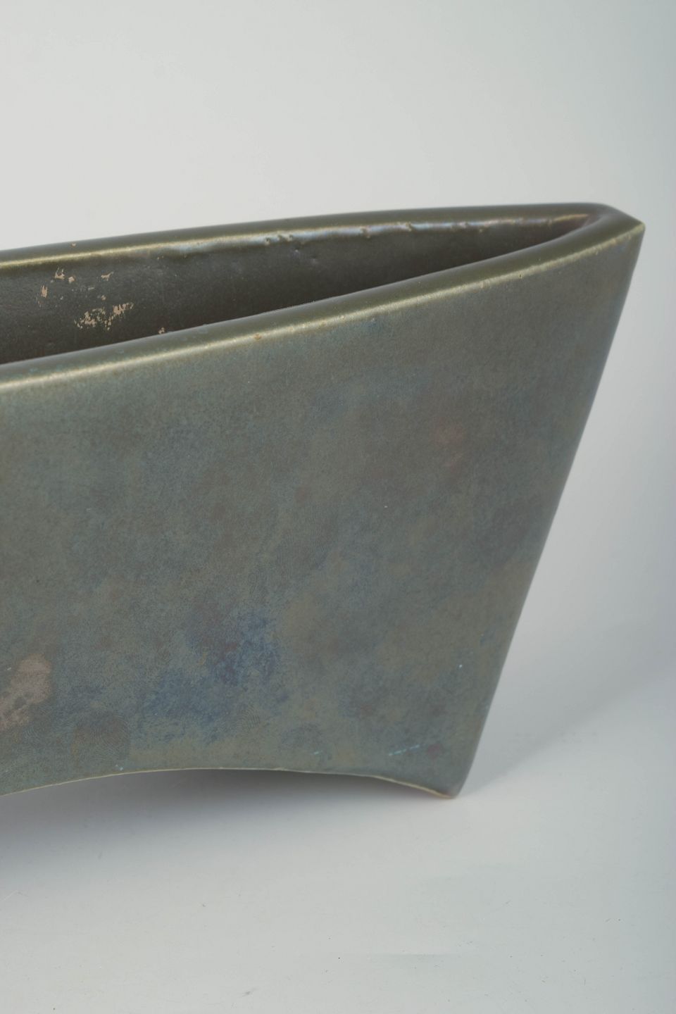 Håndglaseret og signeret vase i karakteristisk asymmetrisk form, udført i stentøj med diskret iriserende overflade og et stramt, moderne udtryk typisk for Mobach-værkstedets 1970’er-produktion.