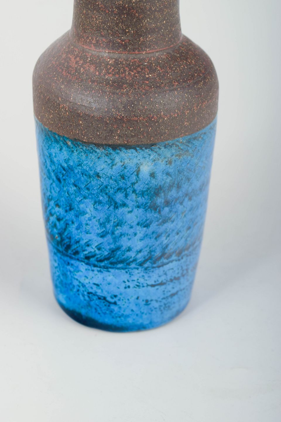 Høj cylindrisk vase med en markant todelt glasurtypologi: den øverste del i rå, ubrændt brunlig stentøjstekstur og den nederste del i en dyb, levende azurblå glasur. Kontrasten mellem de to overflader giver vasen et skulpturelt og moderne udtryk, typisk for Nils Kählers arbejde i 1960’erne.