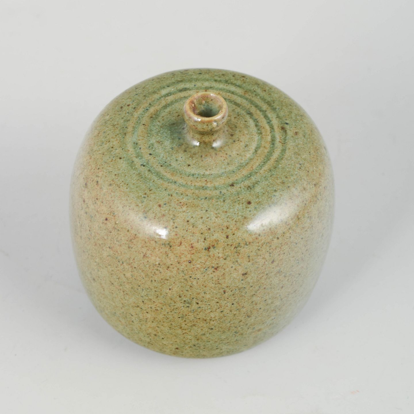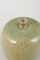 Small thrown stoneware vase with a rounded cylindrical form and a small, concentrically detailed neck. The glaze is in warm green-yellow tones with a finely speckled surface, characteristic of Scandinavian studio ceramics of the era. Signed.