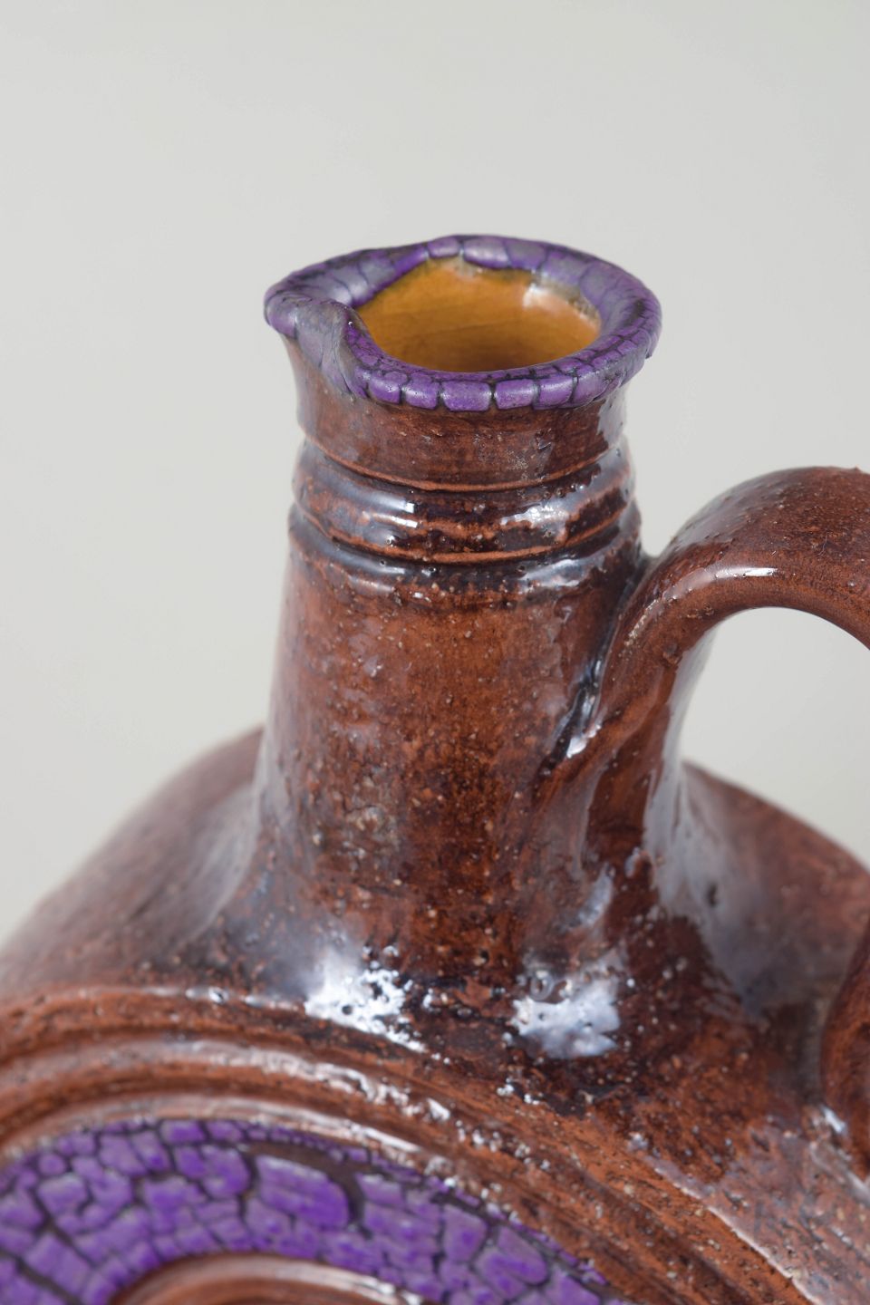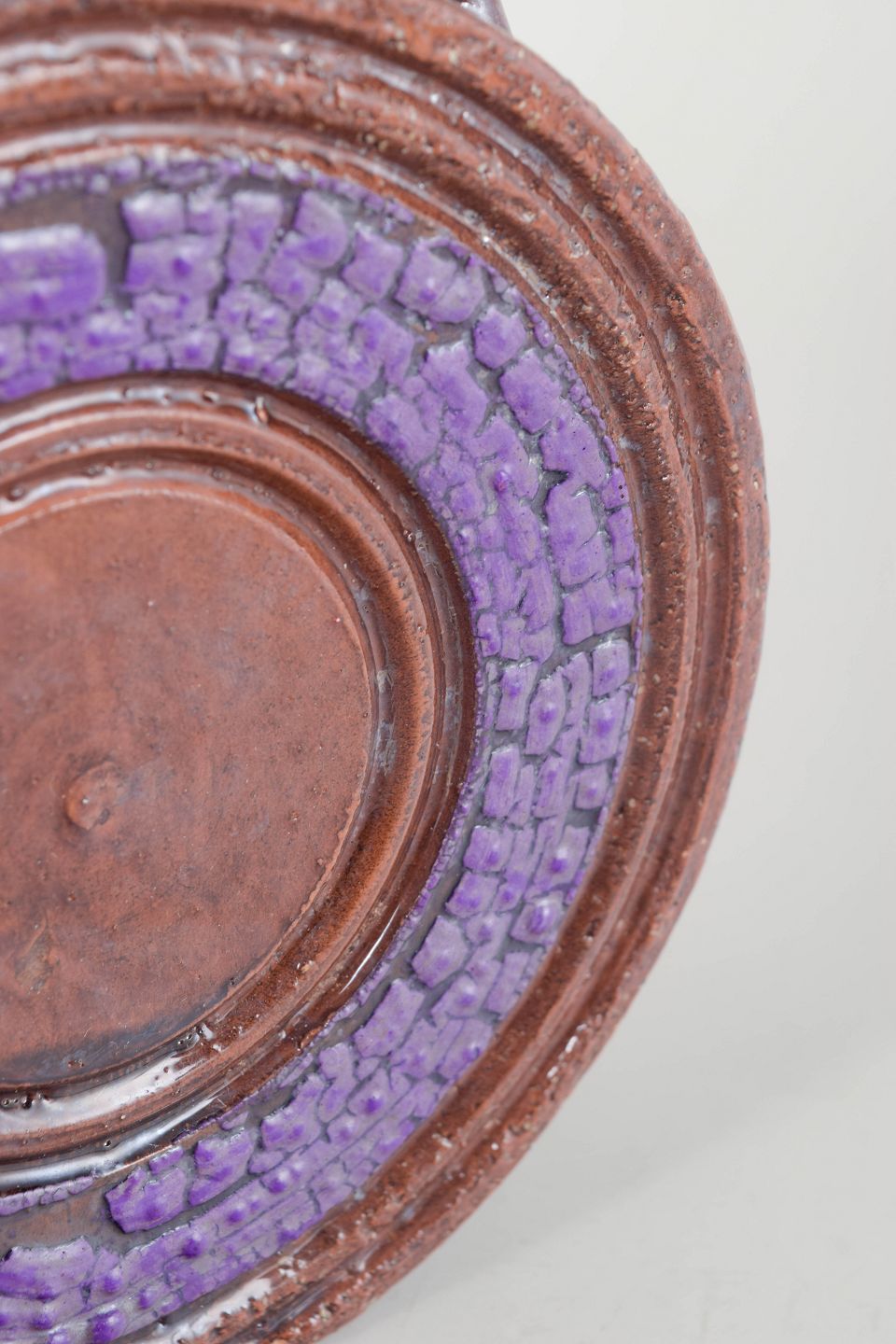 Decorative Italian wine carafe in glazed terracotta with a characteristic circular relief motif and purple glazed centre. The organic shape, softly curved handle and bold colour palette reflect classic Bitossi design from the period.