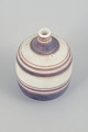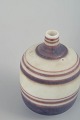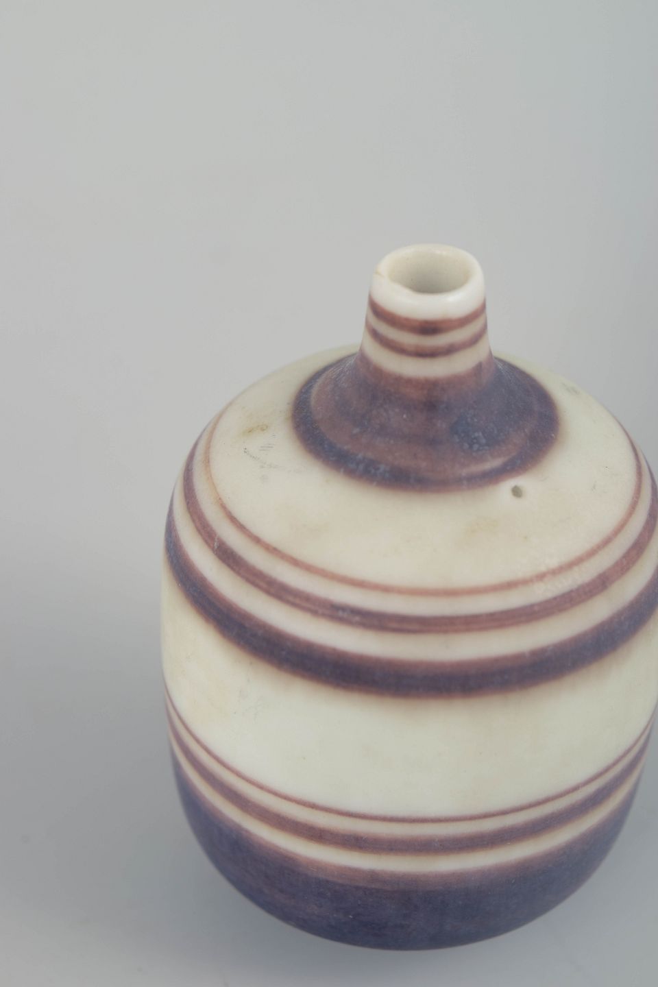 Hand-thrown stoneware miniature vase with characteristic soft striped decoration in violet and cream tones. A refined small form displaying Nylund’s distinctive sense of proportion and tactile surface treatment.
