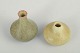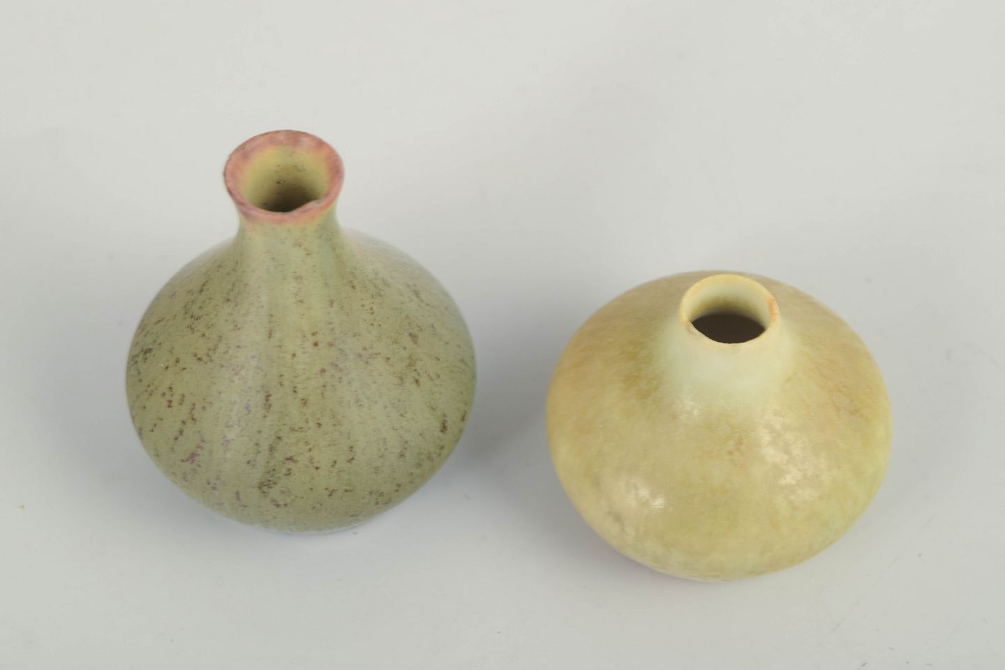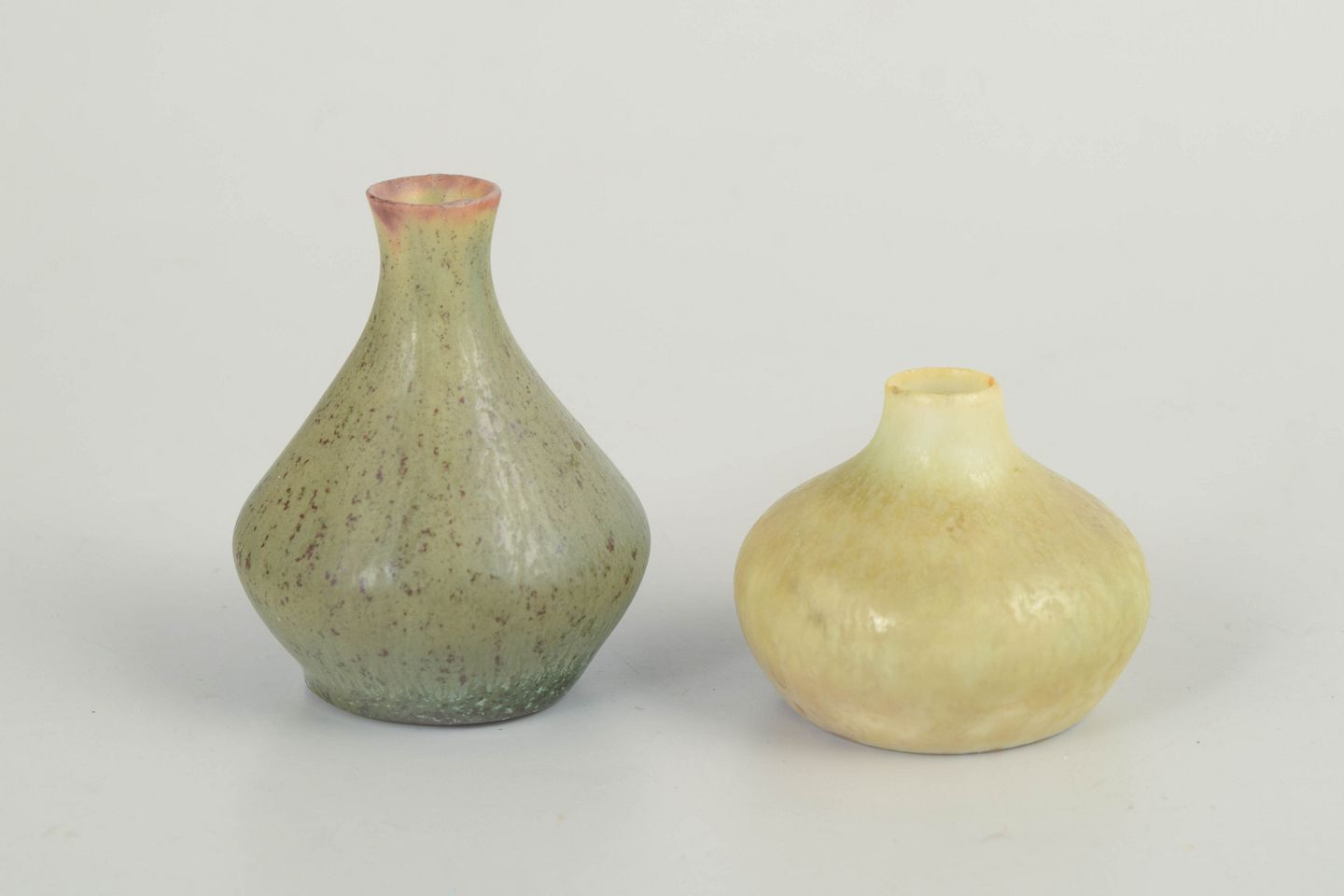 Two elegant stoneware miniature vases with soft, organic silhouettes and subtle matte glazes. One features a greenish glaze with a pink tone at the rim, the other displays pale yellow nuances with refined surface variation – both characteristic of Stålhane’s experimental glaze work.