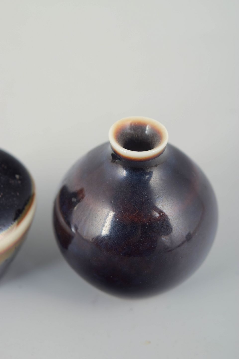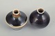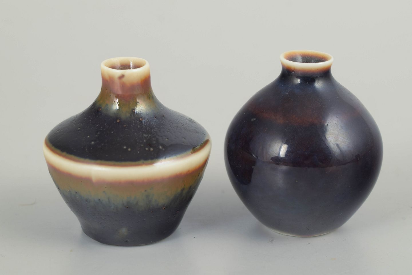 To hånddrejede miniaturevaser i stentøj med smukke, dybt mættede glasurer i mørke violette og brunlige toner, begge med Stålhane’s karakteristiske sans for proportioner og overfladespil.