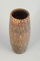 Elegant tall cylindrical stoneware vase featuring the distinctive “Birch Wood” glaze, characterized by vertical, organic streaks in warm brown, green, and golden tones. The surface evokes the texture of tree bark and natural materials and is a classic example of Gunnar Nylund’s nature-inspired aesthetic developed at Rörstrand.