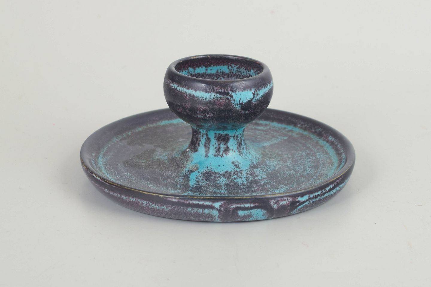 Lav, rund lysestage i stentøj med centralt placeret lysholder og bred, balanceret fod. Udført i karakteristisk grøn og sort dobbeltglasur med levende, let metallisk spil, der løber over overfladen og fremhæver formens ro og tyngde. Et klassisk eksempel på Svend Hammershøis funktionelle og arkitektoniske formsprog fra mellemkrigstiden.