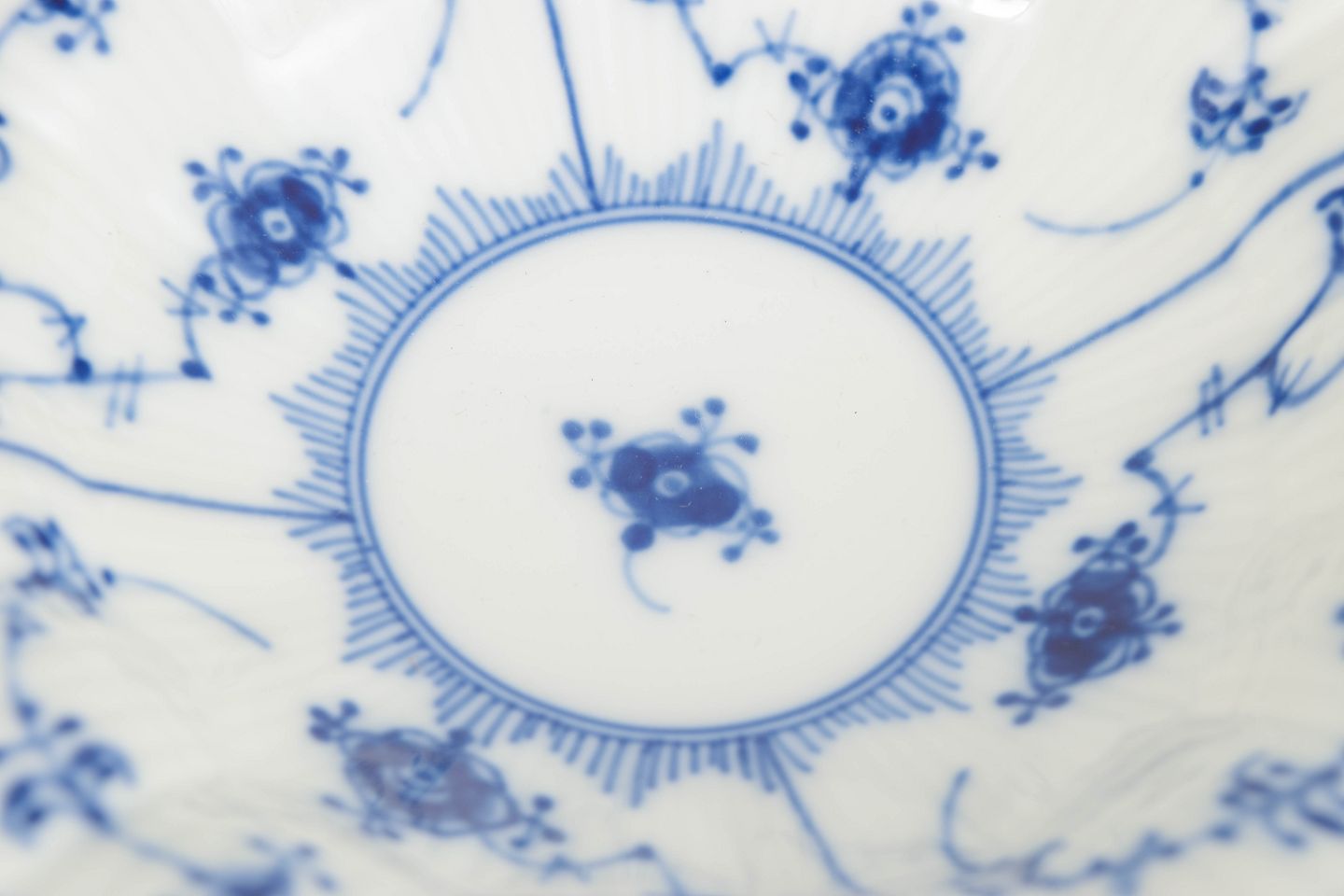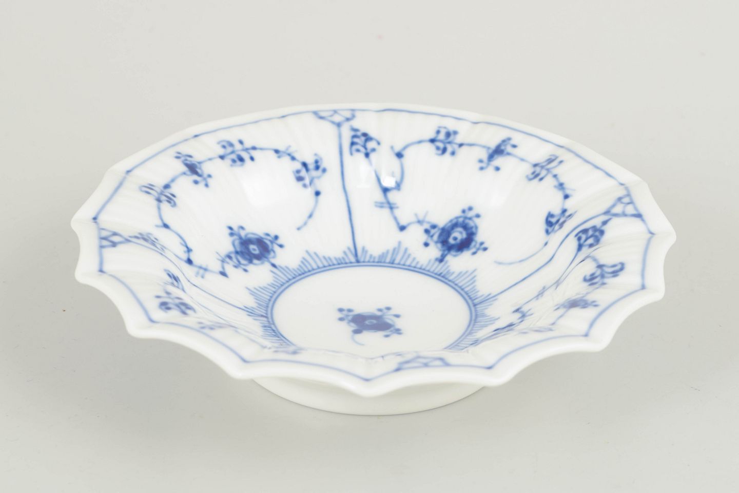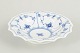 Klassisk asiet i Musselmalet Riflet, udført i riflet form med let bølget kant og dekoreret med håndmalet koboltblå underglasur. Asietten har et centralt spejl omgivet af den karakteristiske musselmalede dekoration og fremstår som en elegant mindre del til servering af kage, dessert eller tilbehør.