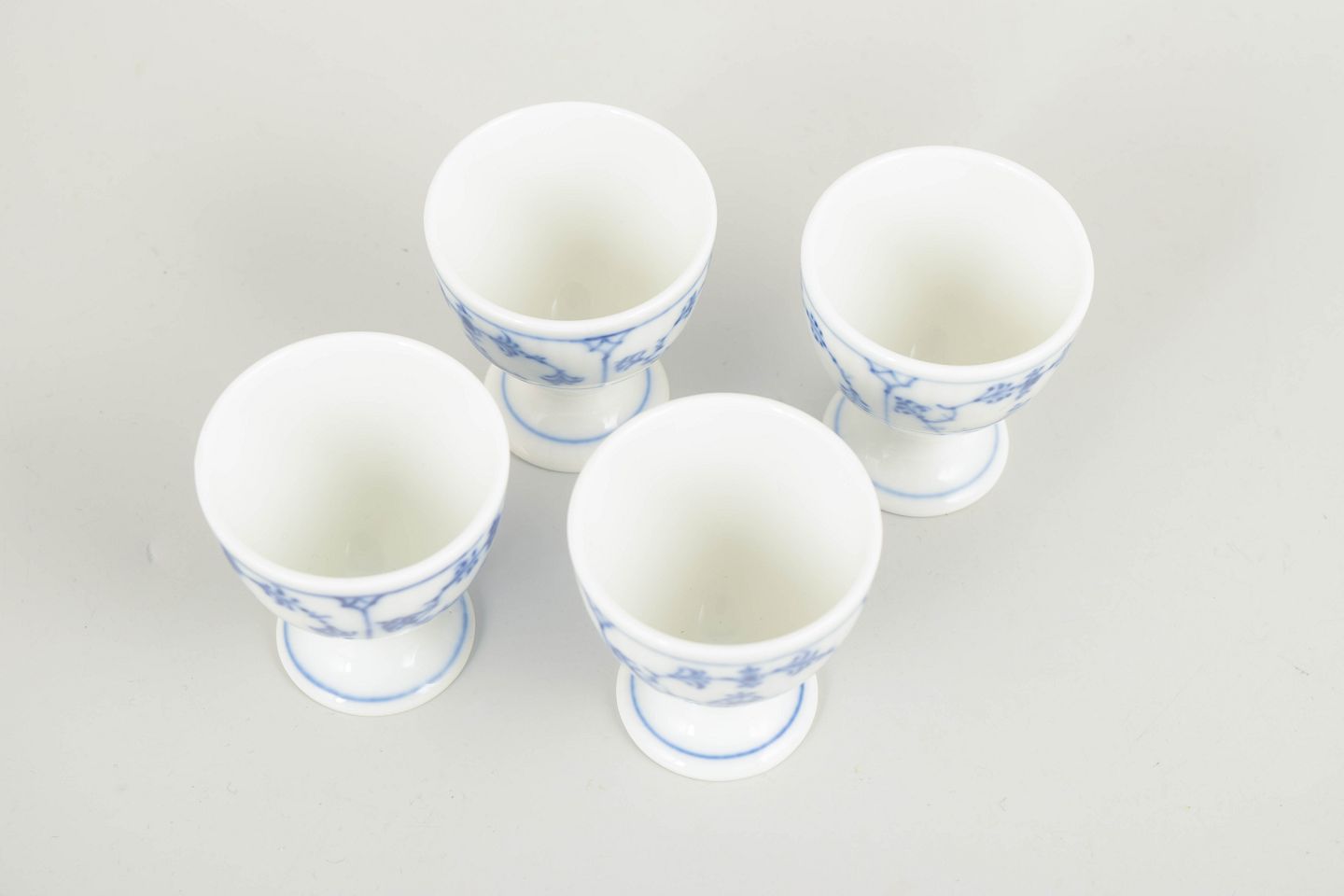 Sæt bestående af fire klassiske æggebægre i Musselmalet Riflet, udført i riflet form med fod og dekoreret med håndmalet koboltblå underglasur. Æggebægrene har en elegant og tidstypisk proportionering og repræsenterer tidlig 1900-tals bordkultur.