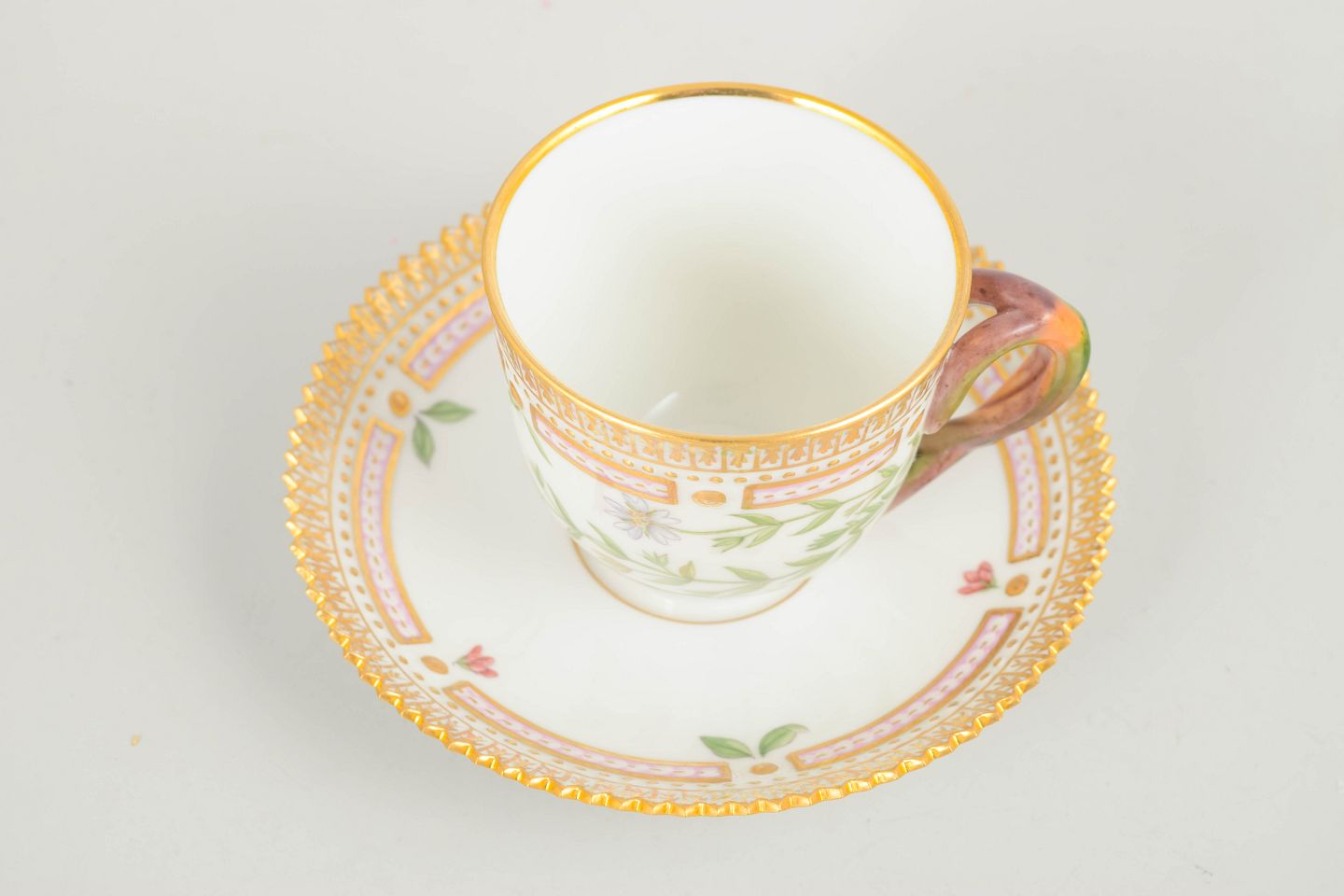 Elegant moccakop med tilhørende underkop i det ikoniske Flora Danica-stel. Koppen er håndmalet med botanisk motiv gengivet efter Flora Danica-værket og udført i stellets karakteristiske, raffinerede formsprog med dekorativ kant. En klassisk og eksklusiv kaffekop.