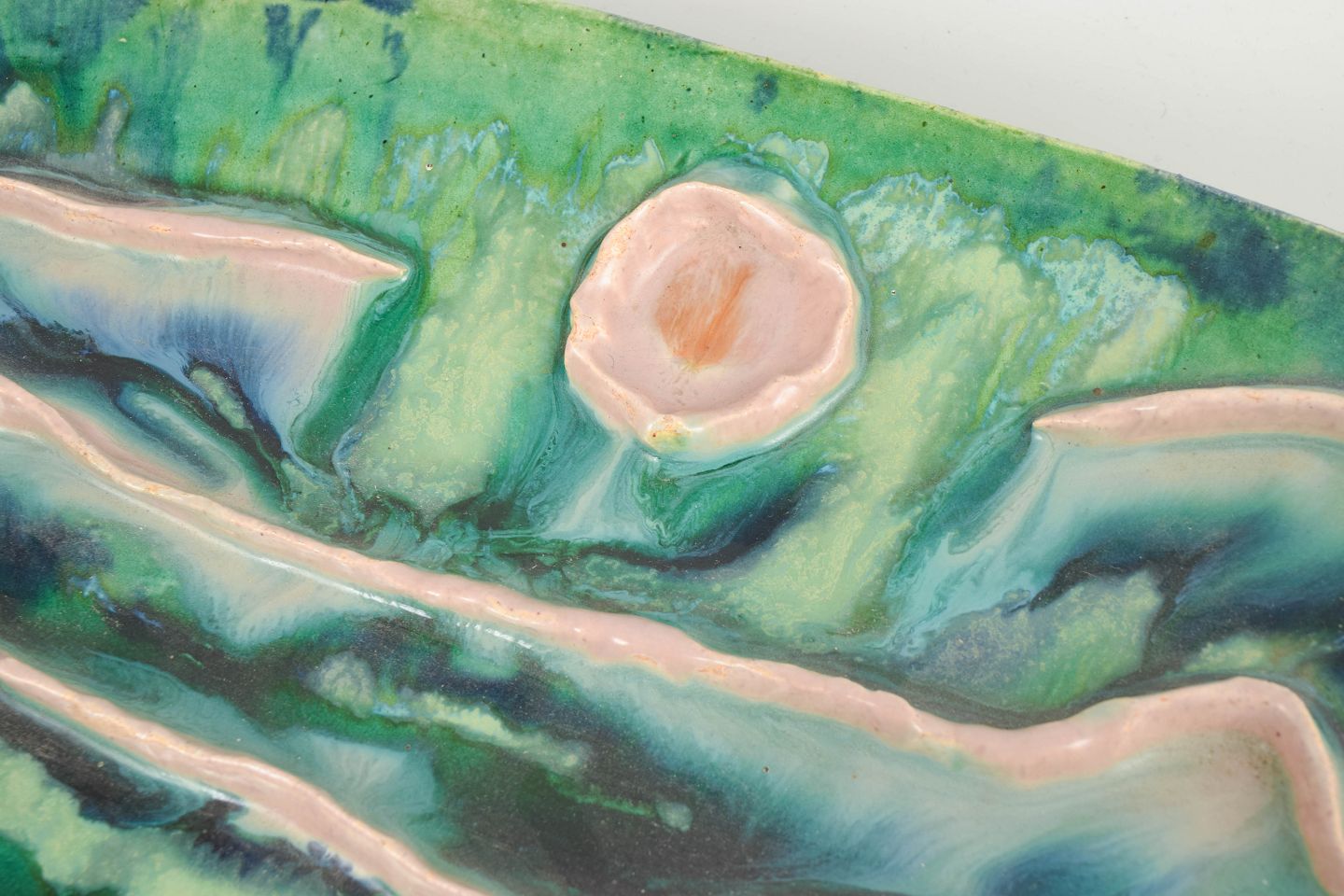 Unique wall-mounted ceramic relief executed in organic forms with pronounced sculptural depth. The surface is richly modelled with flowing lines and raised elements, decorated with vivid green and blue glazes, contrasted by soft pink relief details. An expressive and tactile work that clearly reflects the experimental ceramic language of the 1970s.