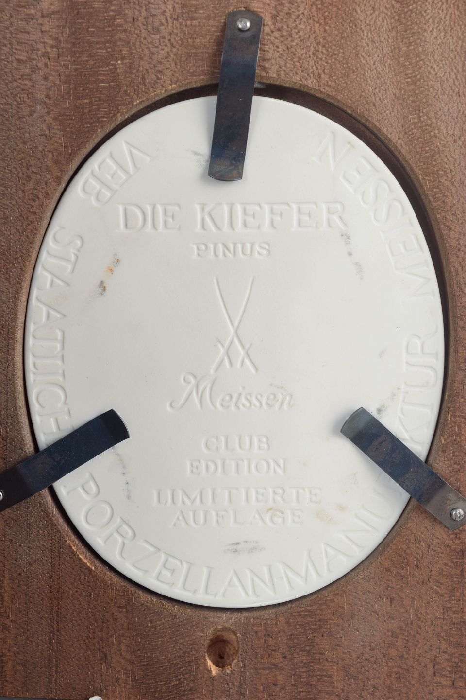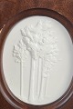 Relief plaque in white biscuit porcelain with a stylised nature motif depicting trees, mounted in a rectangular wooden frame with an oval opening. The matte surface enhances the fine modelling of the relief, giving the piece a classical sculptural character.