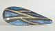 Stor, organisk oval skål i glaseret keramik med abstrakt, hånddekoreret mønster i blå, gule og mørke toner med karakteristisk plettet effekt i glasuren.
