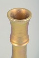 Slank og arkitektonisk udformet vase i stentøj med metallisk, iriserende glasur i gyldne og kobberfarvede nuancer. Vasen har markerede profilerede led og er signeret under bunden.