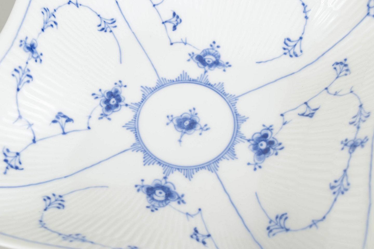 Håndmalet firkantet skål i porcelæn dekoreret med det klassiske musselmalede riflet mønster i blå underglasur. Skålen har svagt buede sider med riflede detaljer og et centralt blomsterornament omgivet af slyngede blomstergrene. Undersiden er fabriksstemplet Royal Copenhagen og annulleret med én indridset streg gennem fabriksstemplet. Model 1/26.