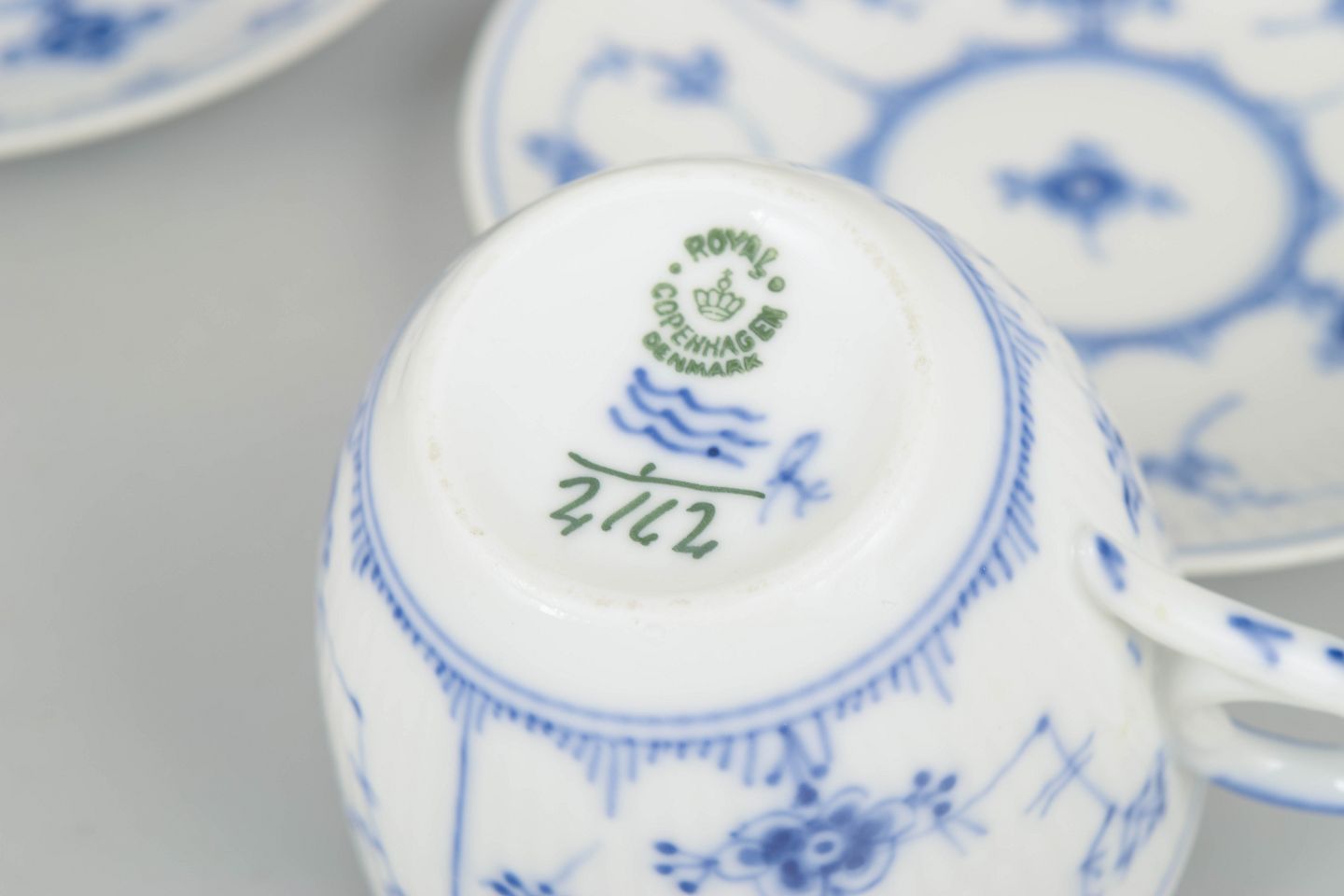 Sæt af fire håndmalede kaffekopper i porcelæn med tilhørende underkopper dekoreret i det klassiske musselmalede riflet mønster i blå underglasur. Kopperne har elegant riflede sider og små buede hanke. Undersiden er fabriksstemplet Royal Copenhagen, første sortering. Model 1/2162.