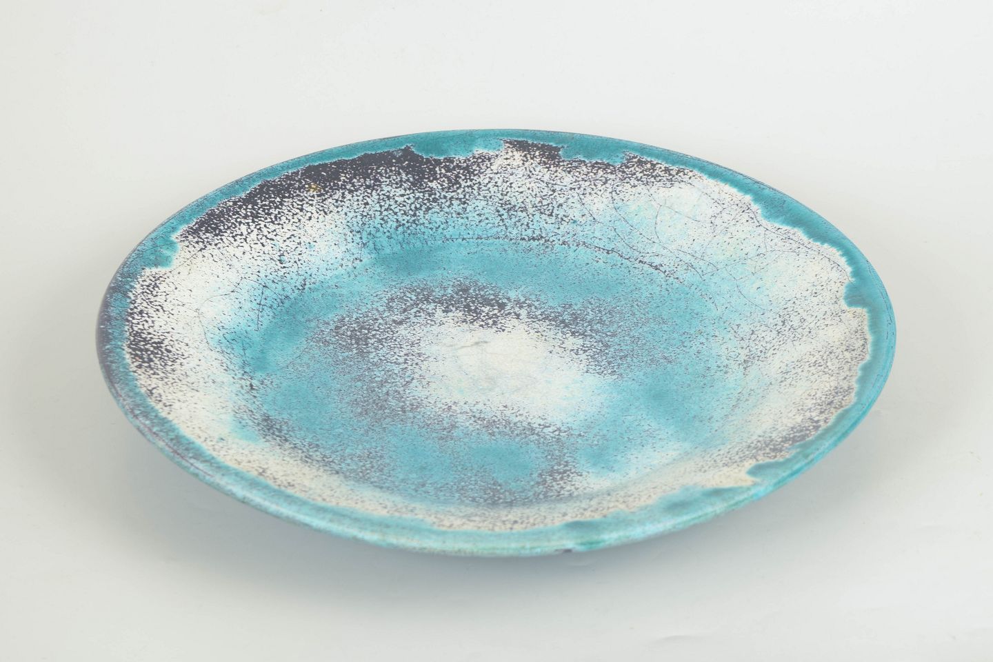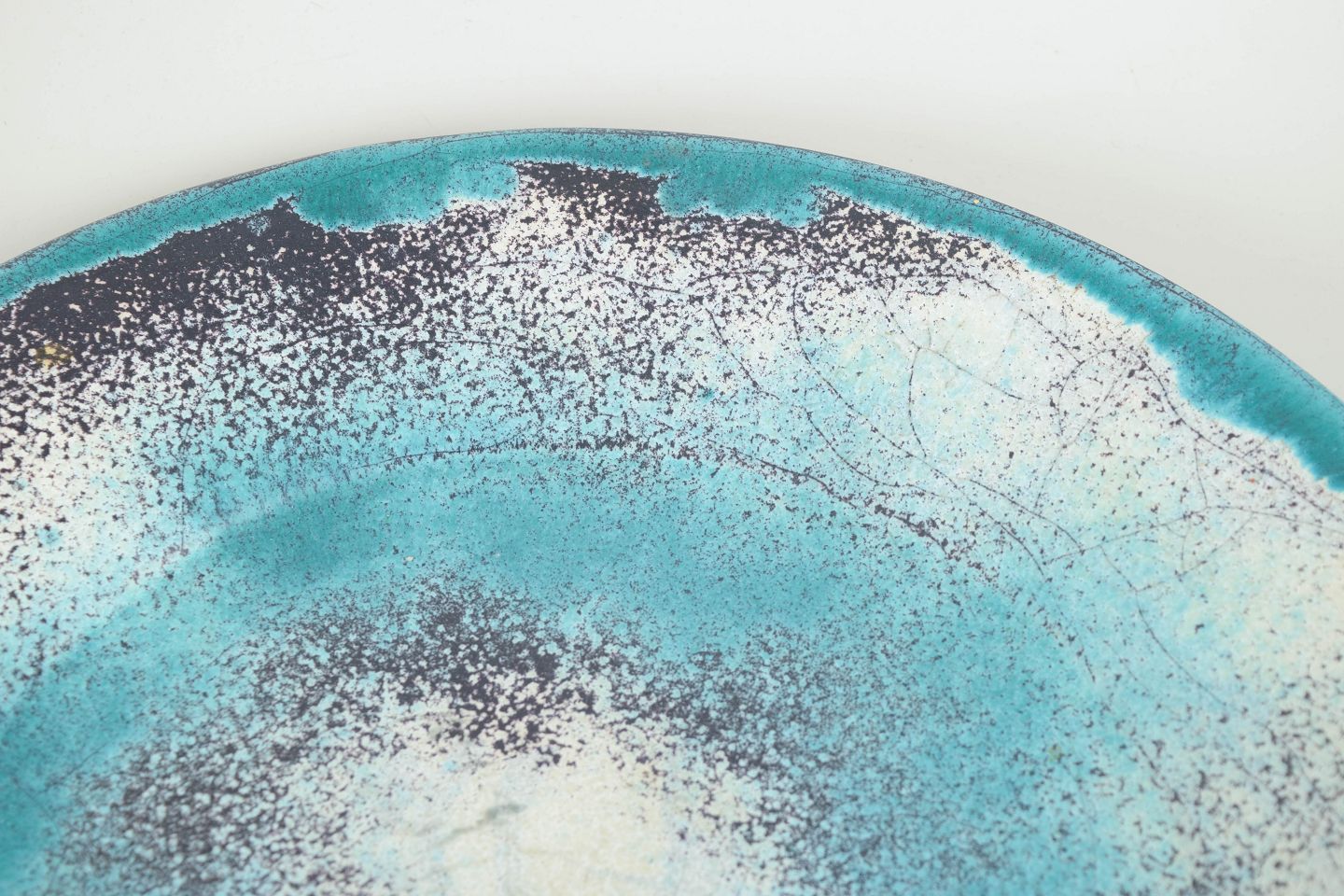 Large circular dish in glazed earthenware featuring a characteristic double glaze in green, turquoise and black tones. The surface shows lively variation and subtle crackle, typical of Hammershøi’s experimental glaze techniques. Signed HAK to the base.