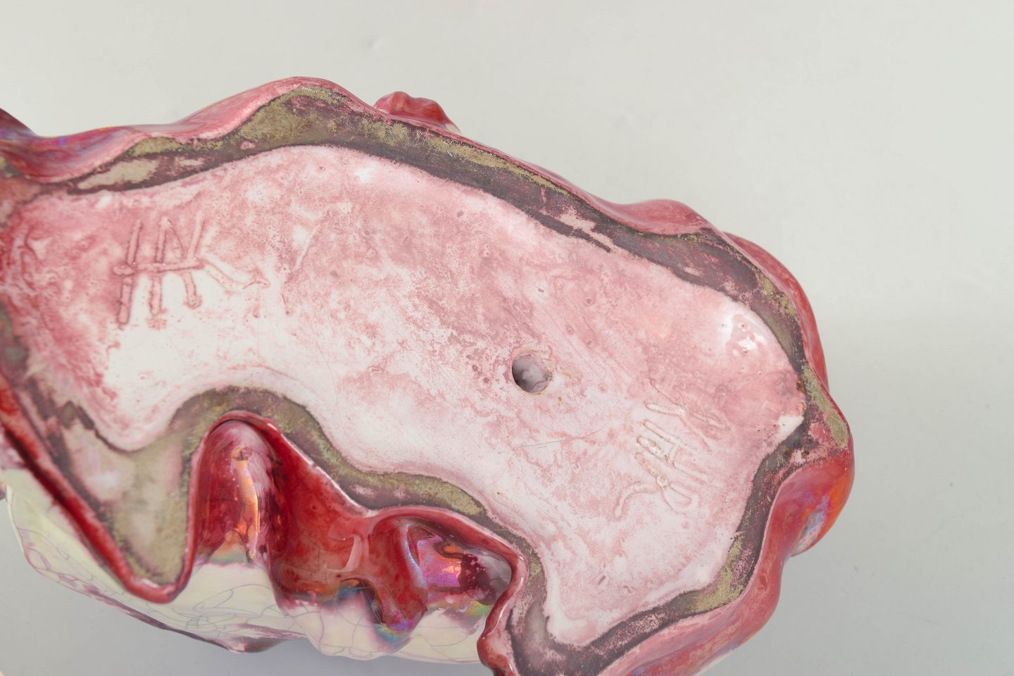 Naturalistisk udformet figurgruppe i glaseret lertøj forestillende en legende løve og løvinde. Dekoreret med kraftig rød og cremefarvet krakeléglasur med organiske overgange.