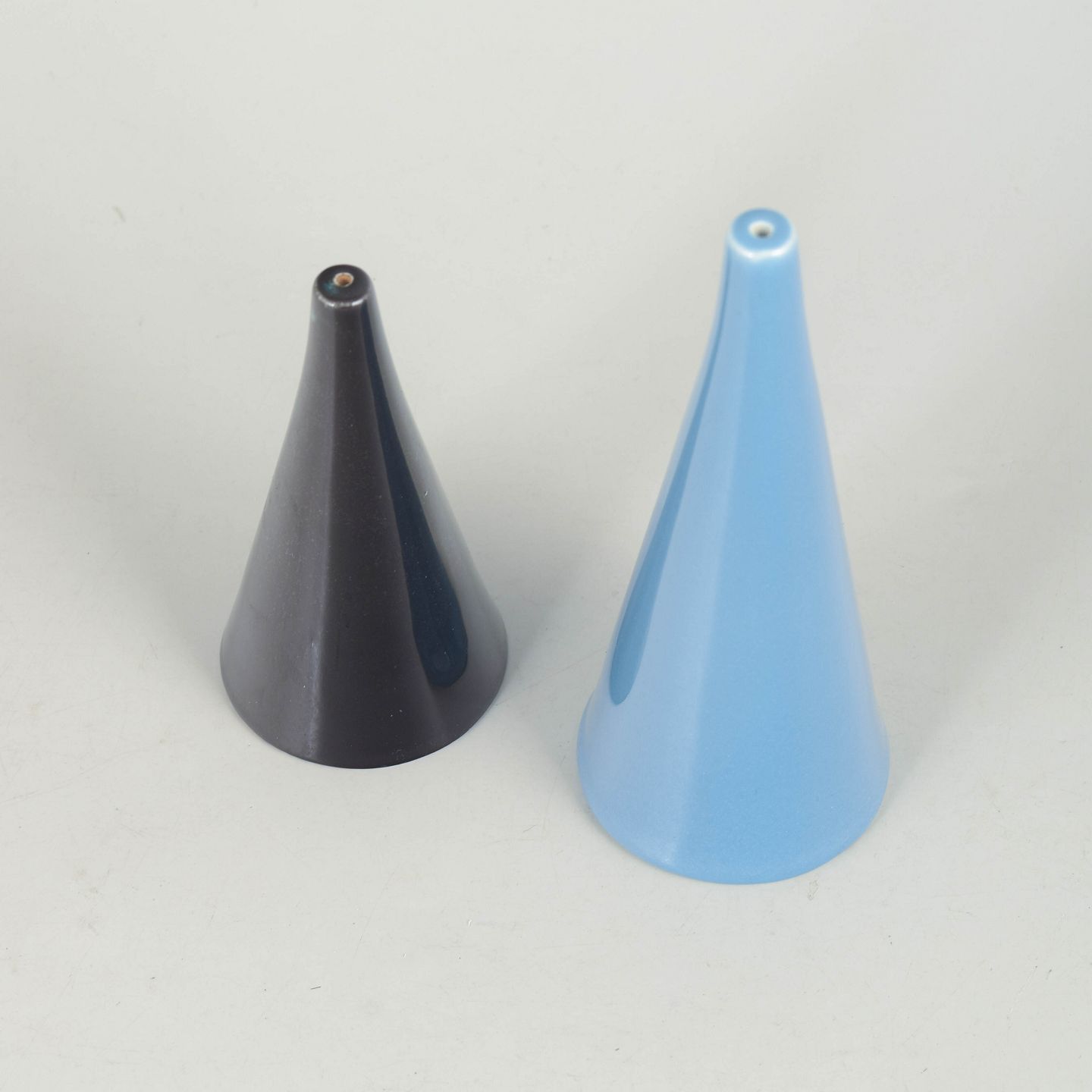 Håndlavet sæt i glaseret stentøj med koniske former i henholdsvis lys blå og mørk glasur. Enkle og skulpturelle former med tydelig modernistisk karakter. Model Colorado.