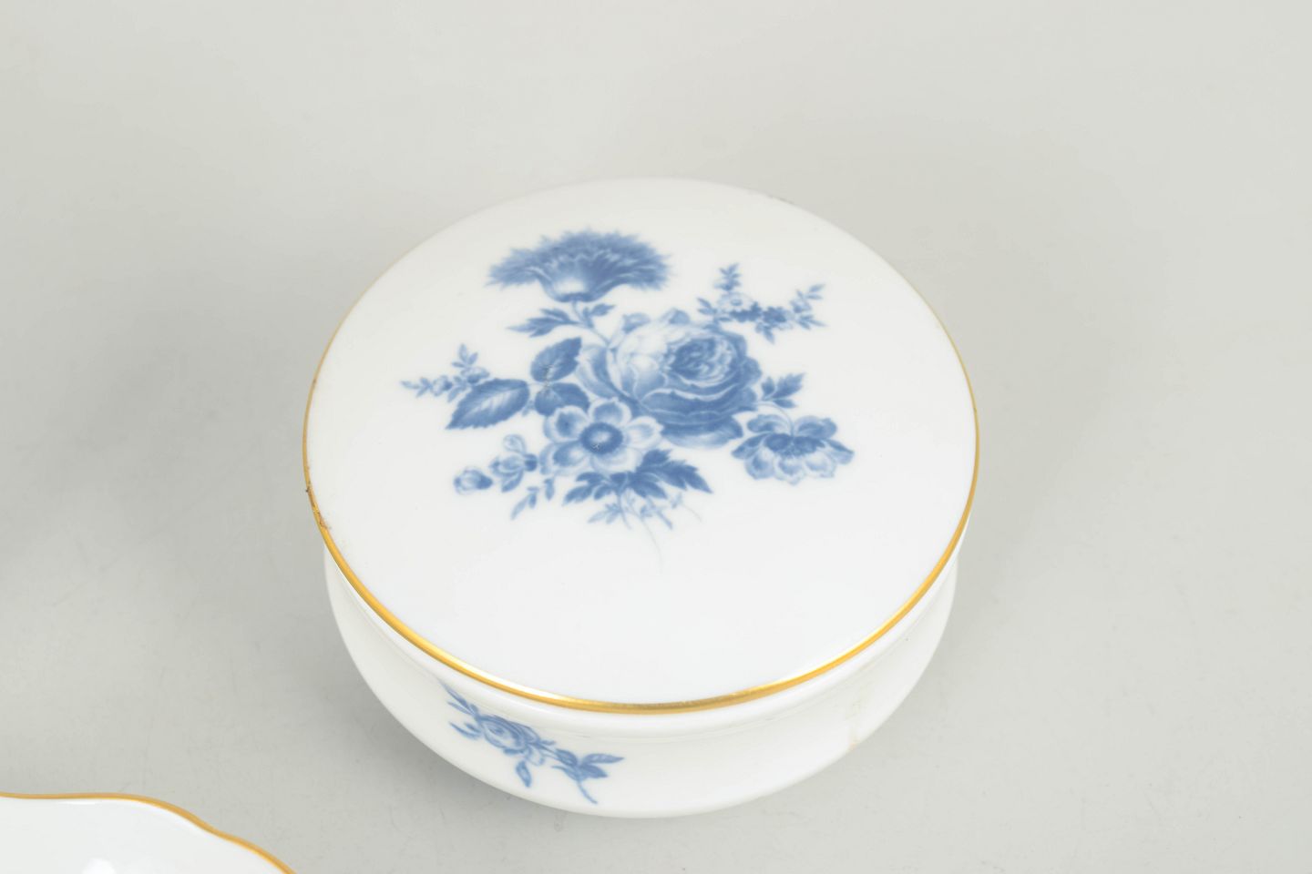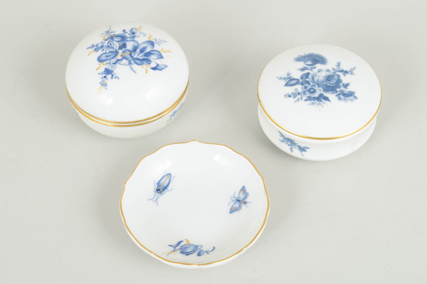 Two lidded jars and a small dish decorated with floral and insect motifs in blue tones with gilt rims. Model Aquatinta. Marked with Meissen crossed swords, first factory quality.