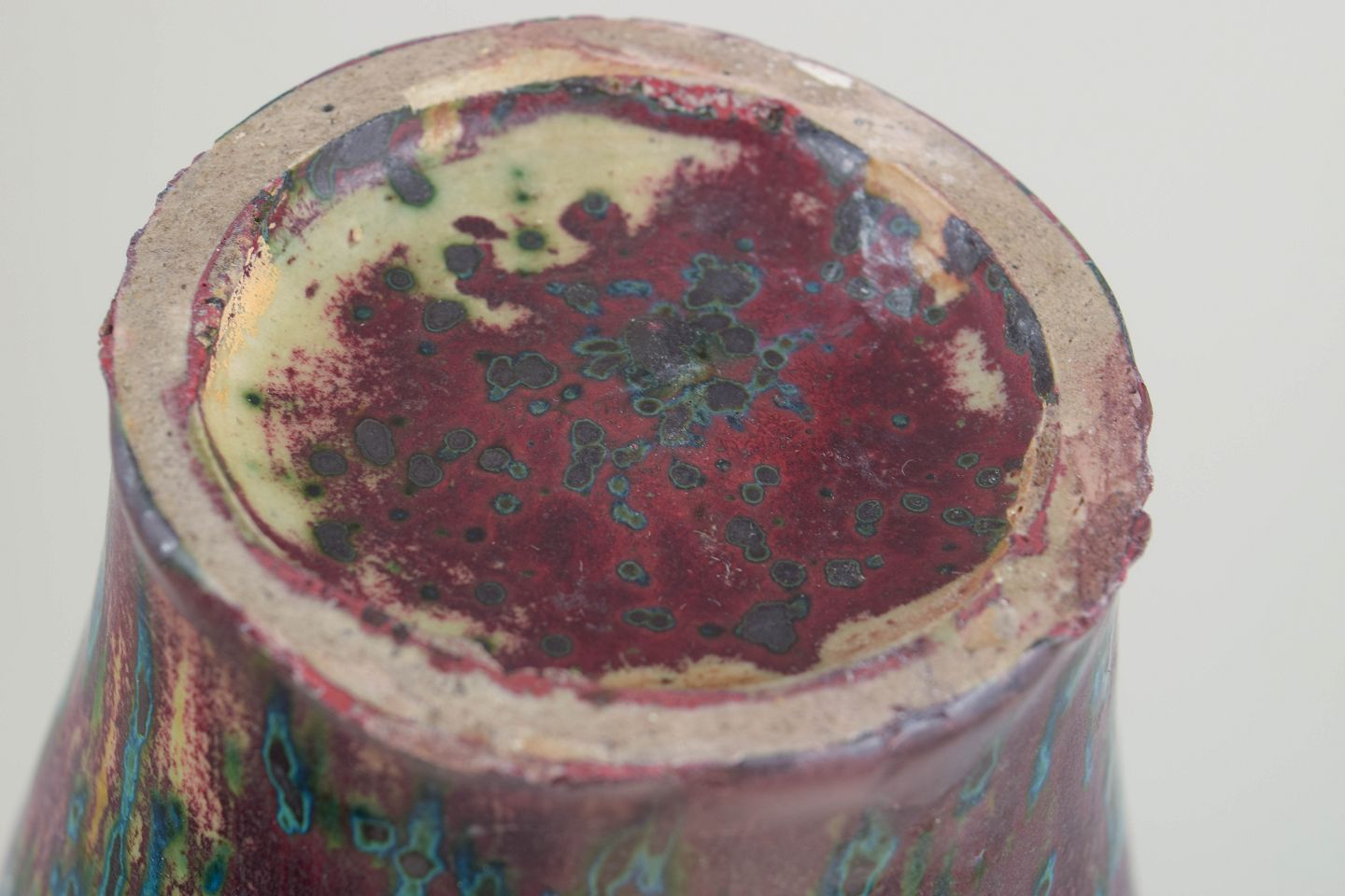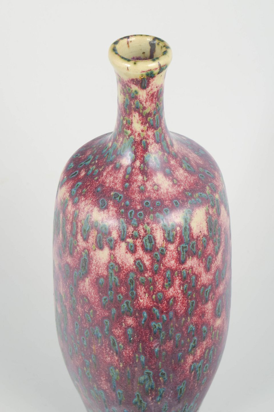 Slank, organisk formet vase i keramik med høj hals og levende krystalglasur i rosa, violette og turkise nuancer. Usigneret eksemplar.