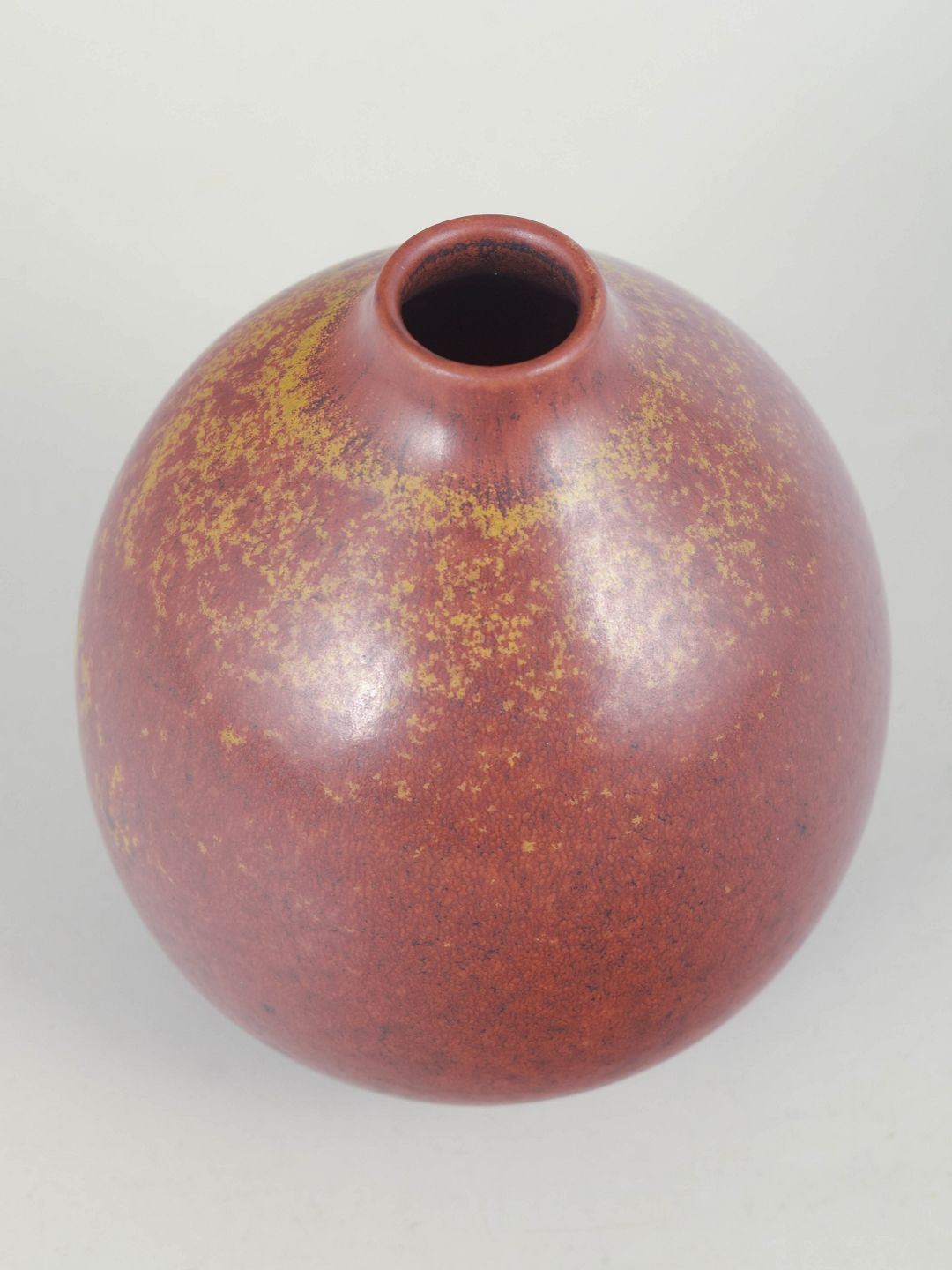 Organisk formet vase i stentøj med rund korpus og smal hals, dekoreret med dyb rødbrun glasur med gyldne nuancer.