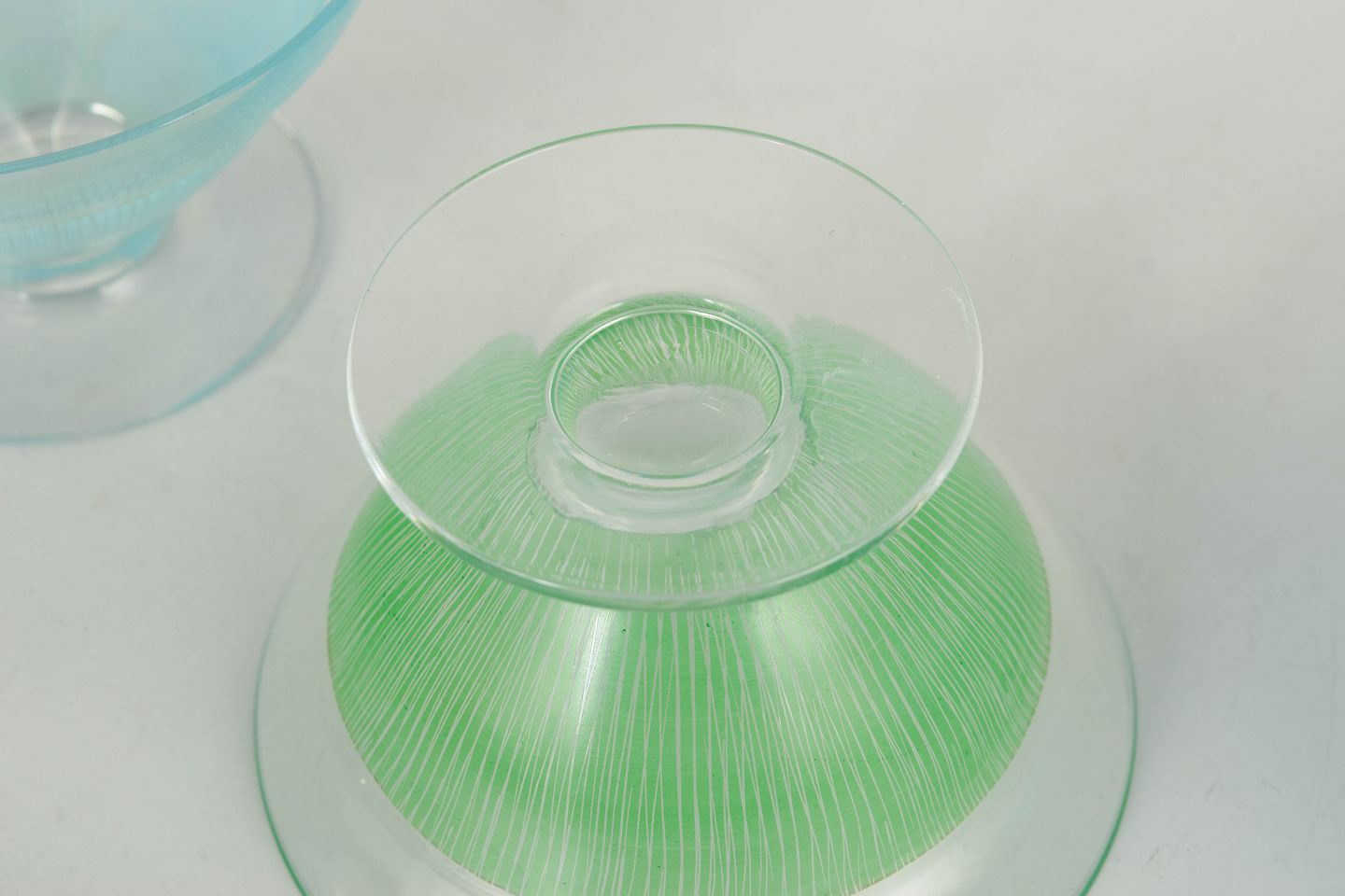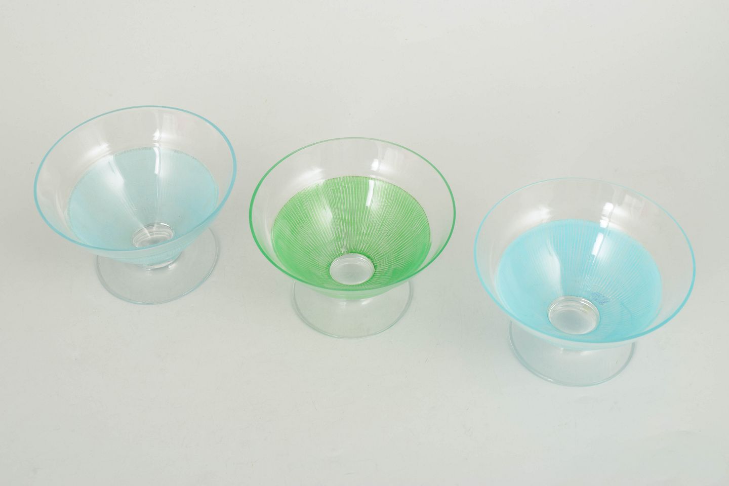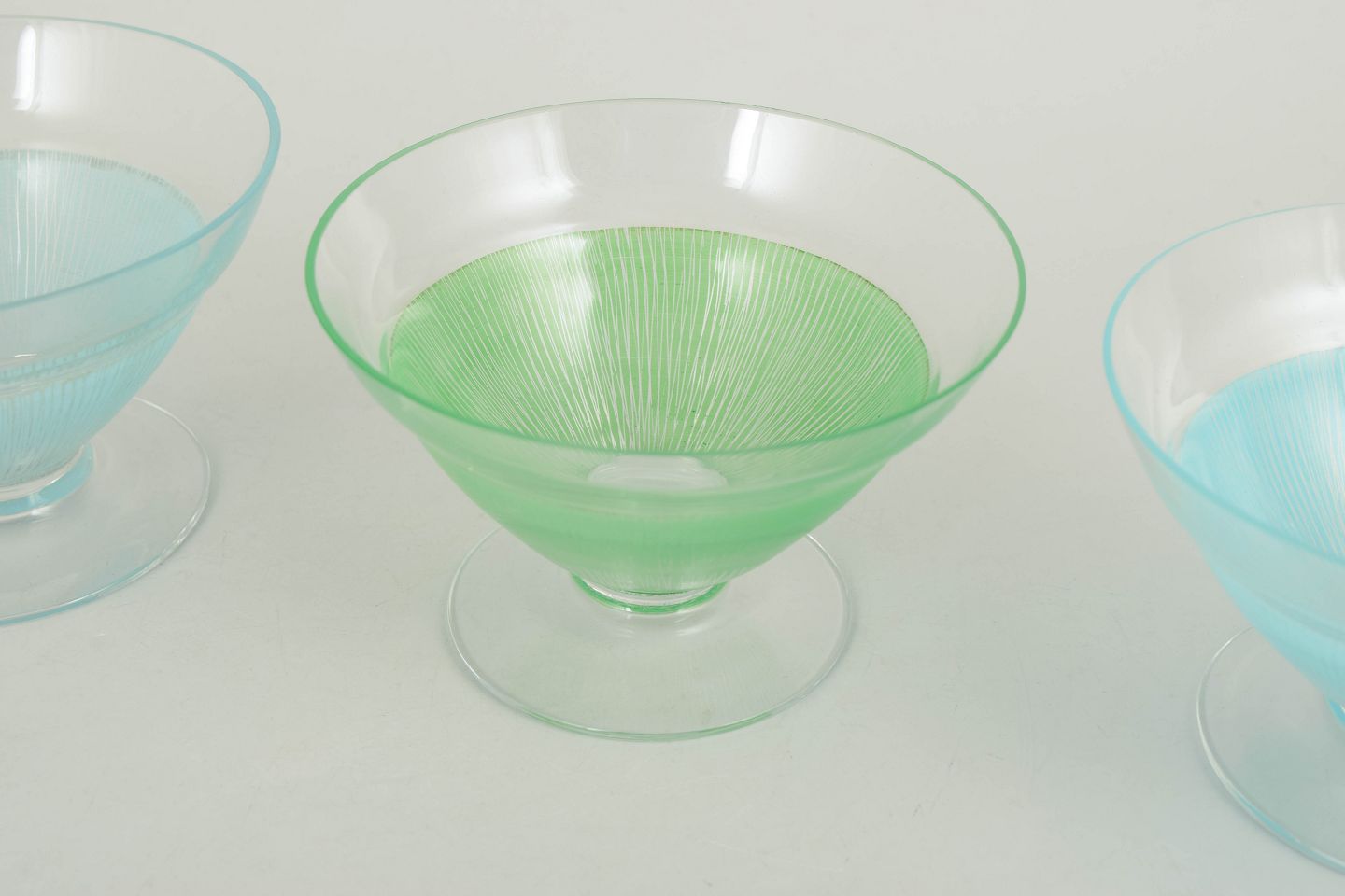 Elegant stemmed glass pieces in clear glass with fine coloured ribbed structures in blue and green tones. Light and decorative forms from the 1960s, suitable as both cocktail glasses and dessert bowls.