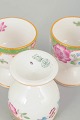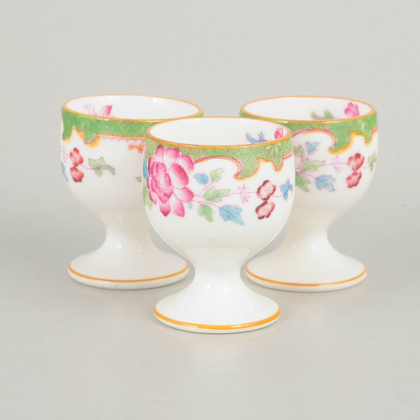 Dekorative æggebægre i porcelæn med farverig blomsterdekoration i Temple mønster og karakteristisk grøn bort.