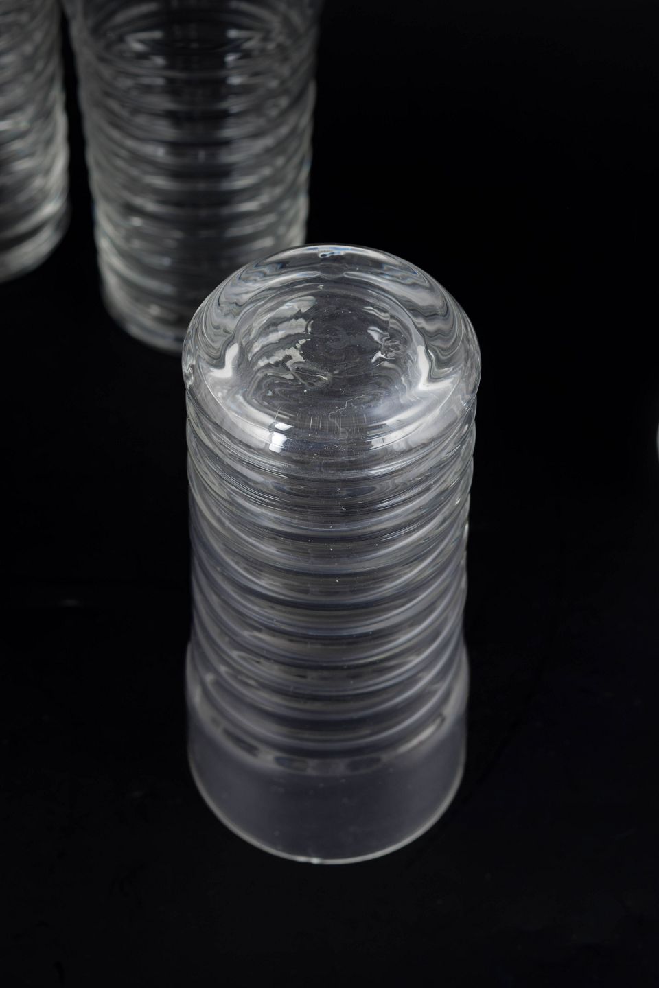 Clear glass from the Perpetum Mobile series with a distinctive ribbed structure and cylindrical form.