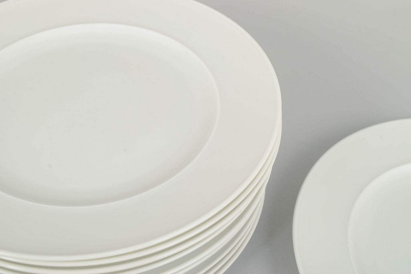 Enkle og elegante tallerkener i hvidt porcelæn med klassisk form og let forhøjet fane. Tidløst design fra Rosenthal, velegnet til både hverdagsbrug og opdækning.