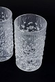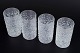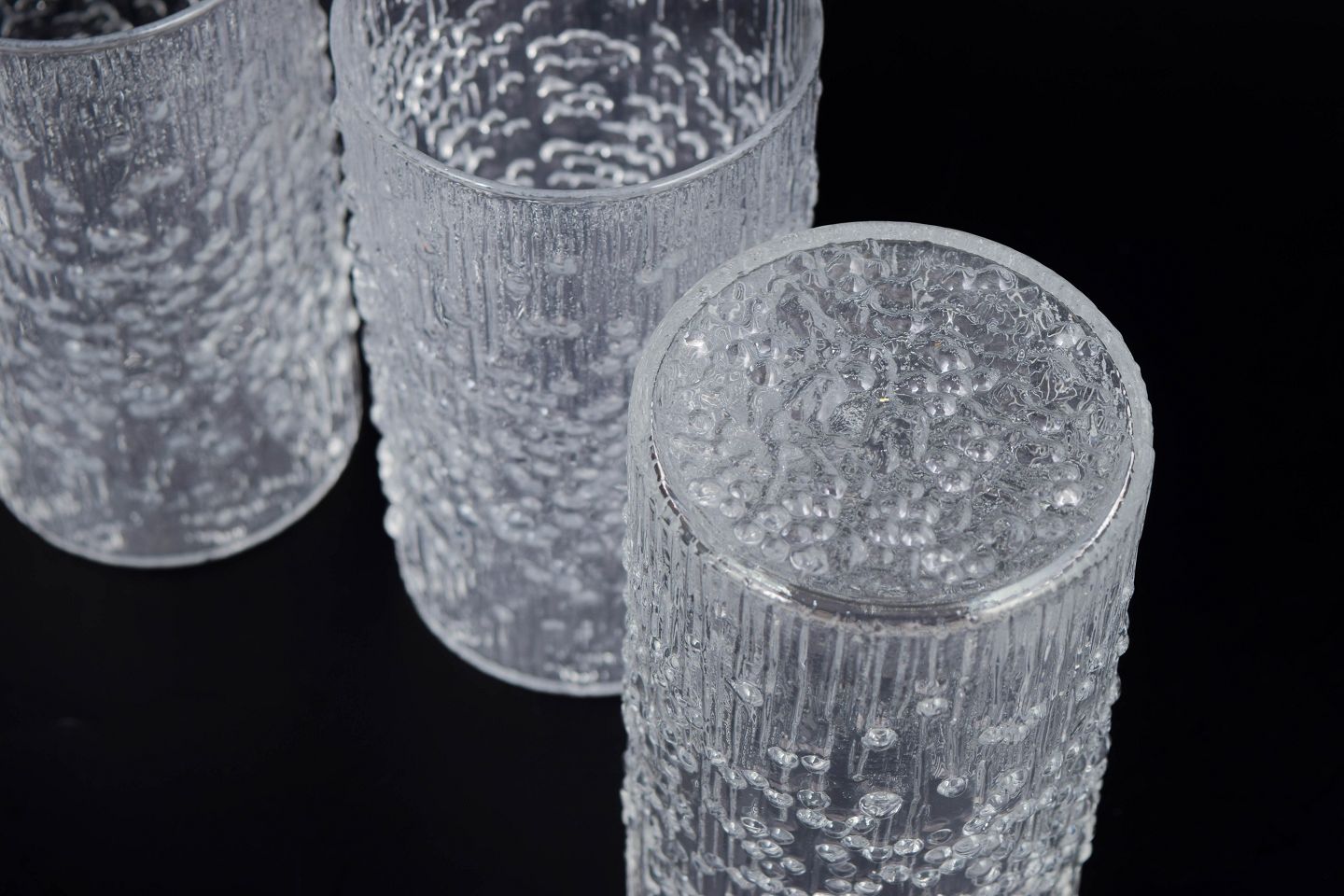Set of four drinking glasses in pressed glass featuring a distinctive organic texture and relief pattern that creates a lively interplay of light across the surface. The design is a classic example of Finnish glass design from the period. Hopla model in clear glass.