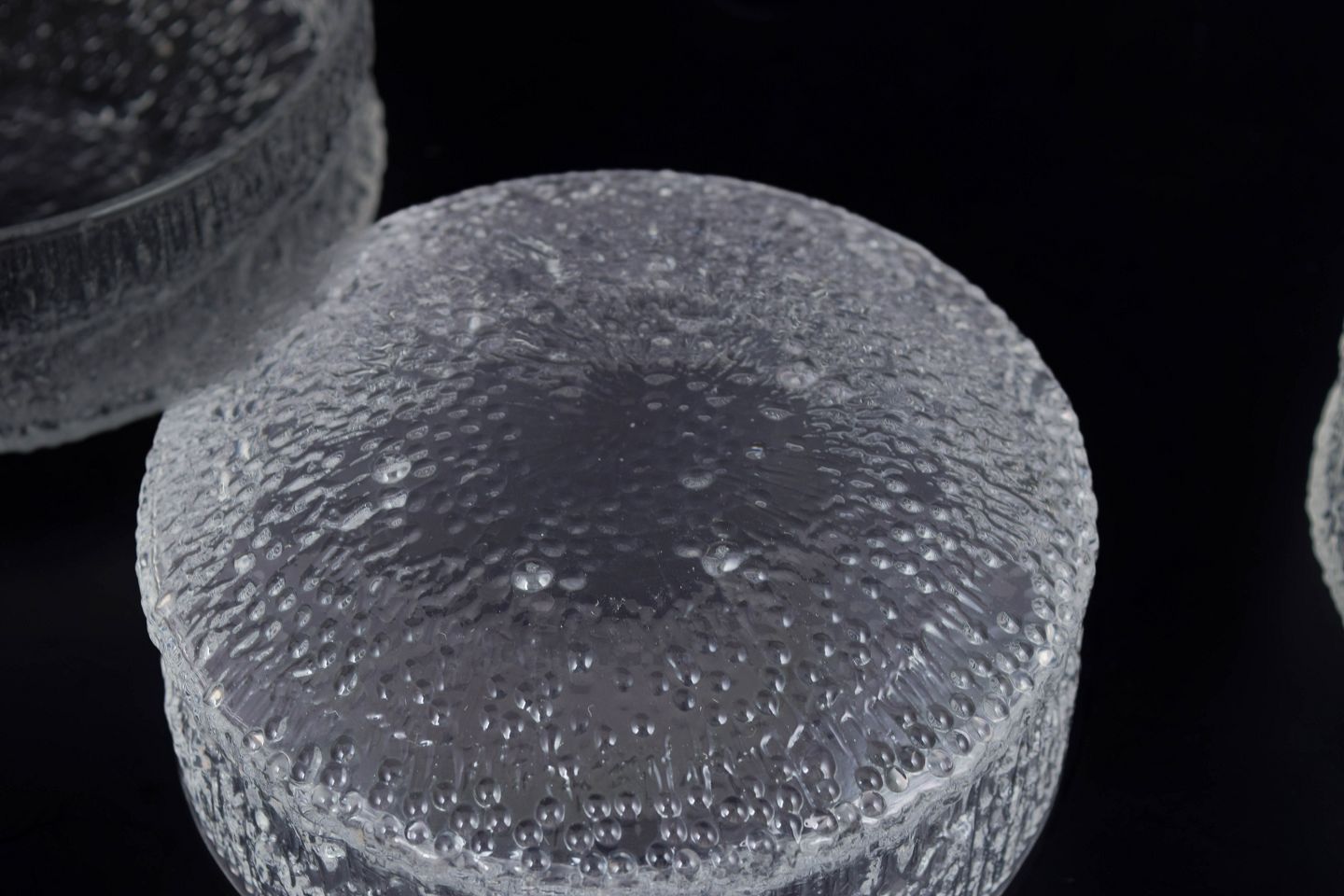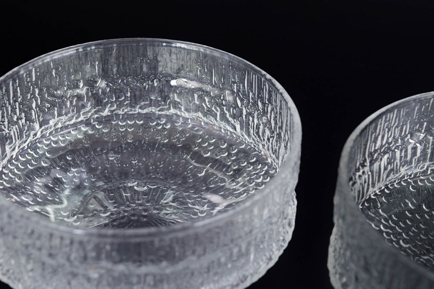 Set of three smaller pressed glass bowls featuring a distinctive organic texture and refined circular relief pattern. The design creates a beautiful interplay of light in the glass and represents a classic example of Finnish glass design. Hopla model in clear glass.