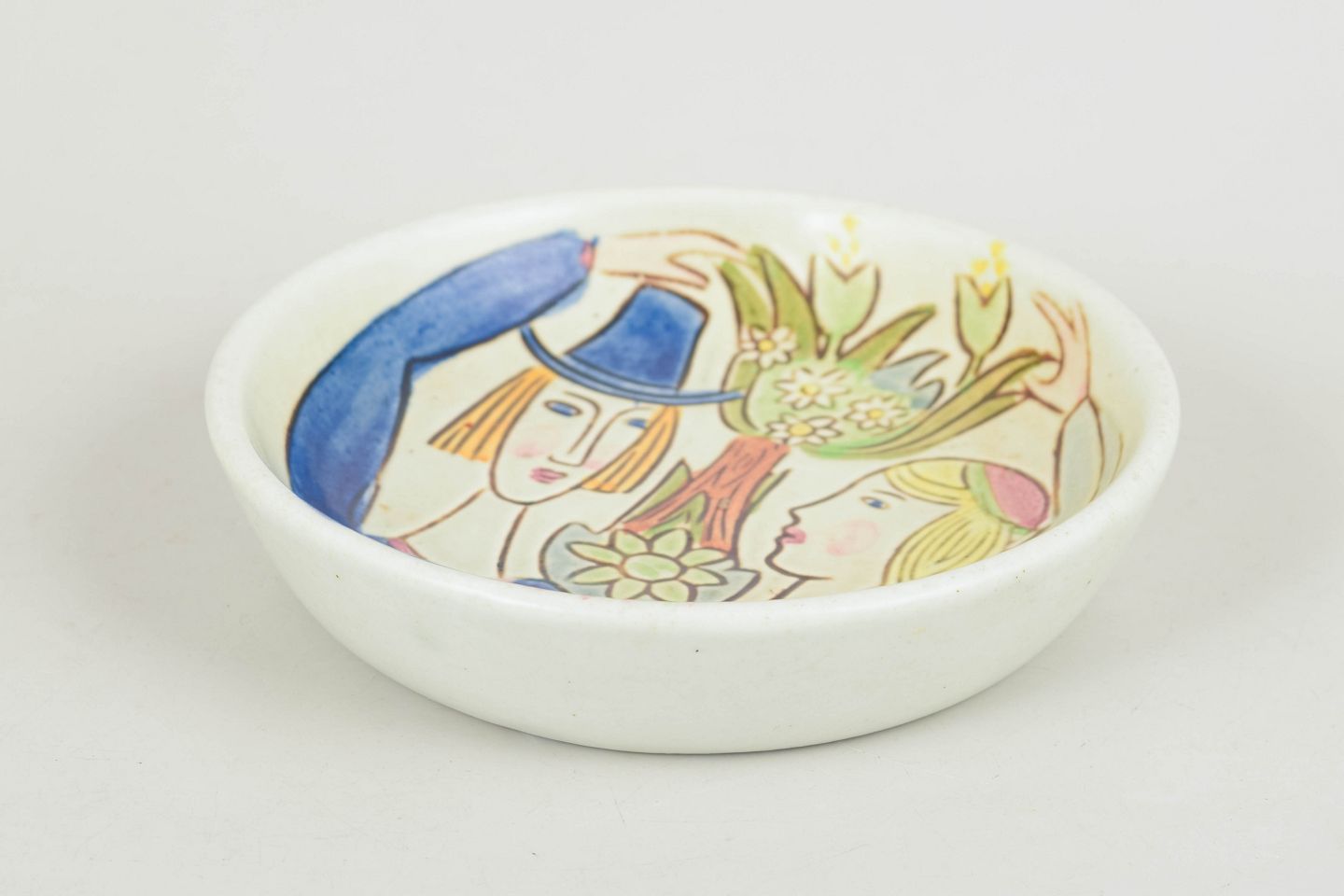 Decorative stoneware bowl with hand-painted figurative decoration in blue, red and natural tones, executed in a characteristic artistic style reflecting mid twentieth century Scandinavian ceramics.