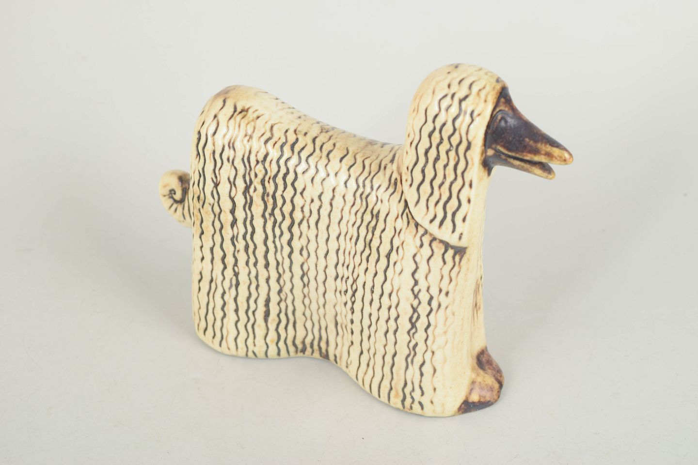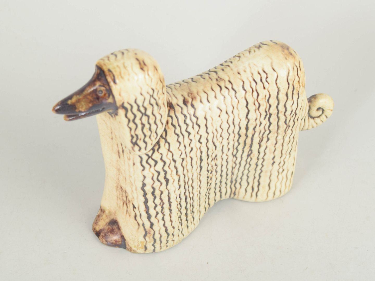 Decorative dog figurine in stoneware with a stylized elongated form and characteristic flowing coat rendered in relief. Glazed in warm beige and brown tones, typical of Lisa Larsson’s work from the period.