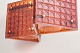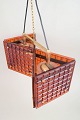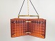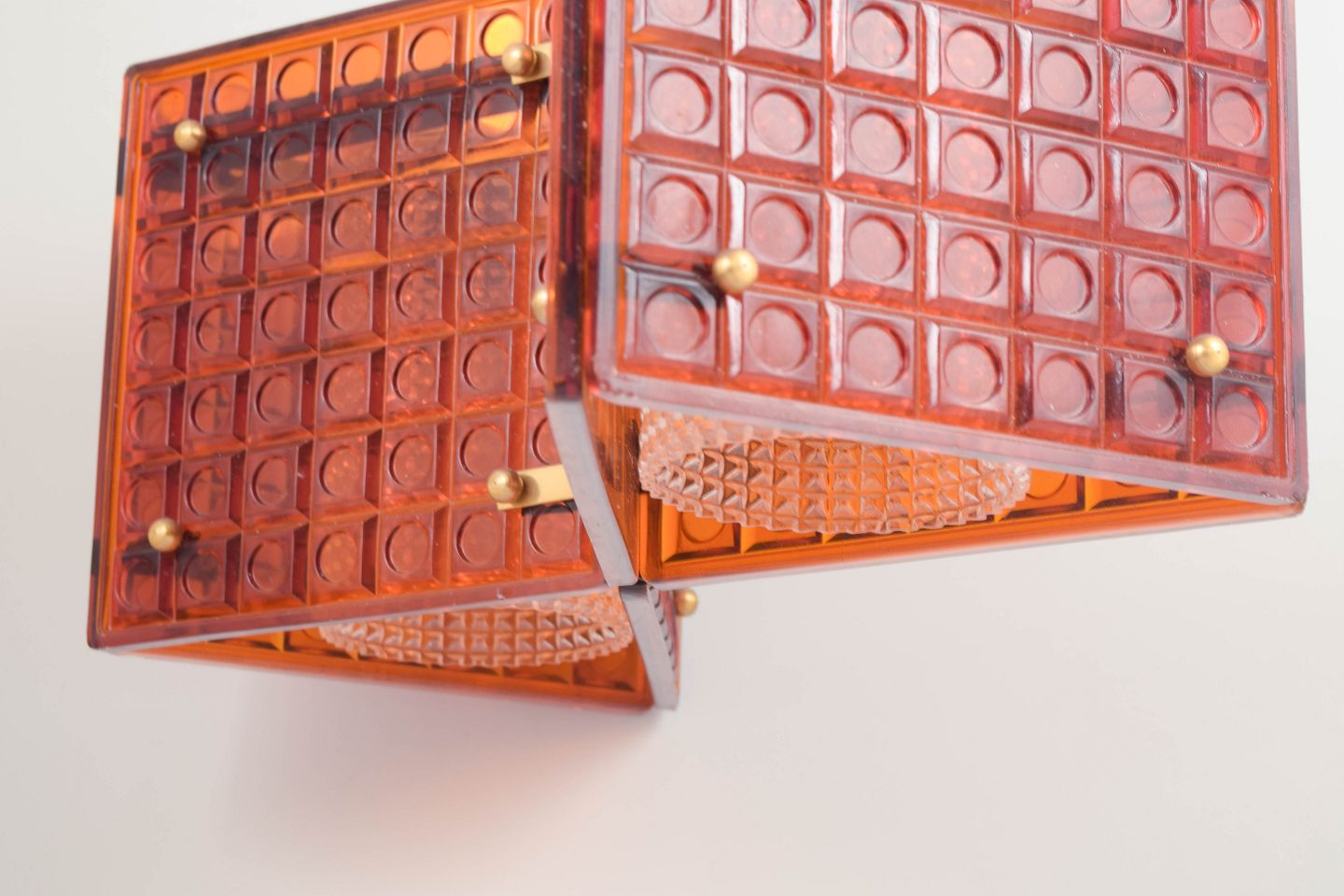 Dekorativ loftlampe med geometrisk form opbygget af glasfelter i varm ravtone indfattet i messingstruktur. Ophæng i metaltråd, giver et elegant og let udtryk med smukt lysgennemfald.