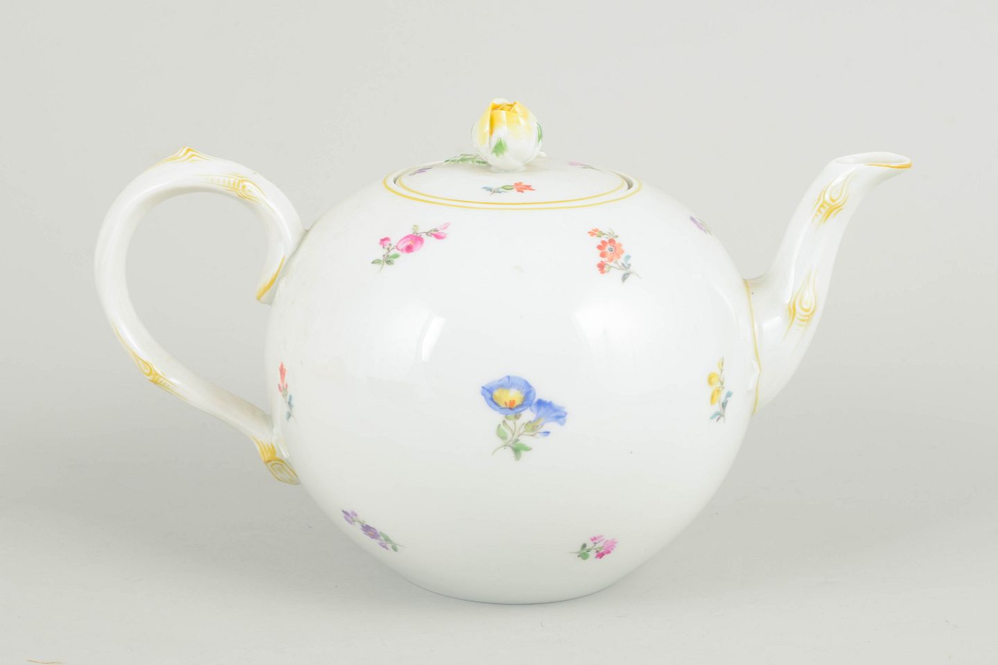 Porcelain teapot hand painted with polychrome flowers and decorated with a gilt rim. Rounded body with curved spout and elegant handle, complete with lid and finial, executed in classic Meissen style from the mid 20th century. Marked on the base with Meissen crossed swords, first factory quality.