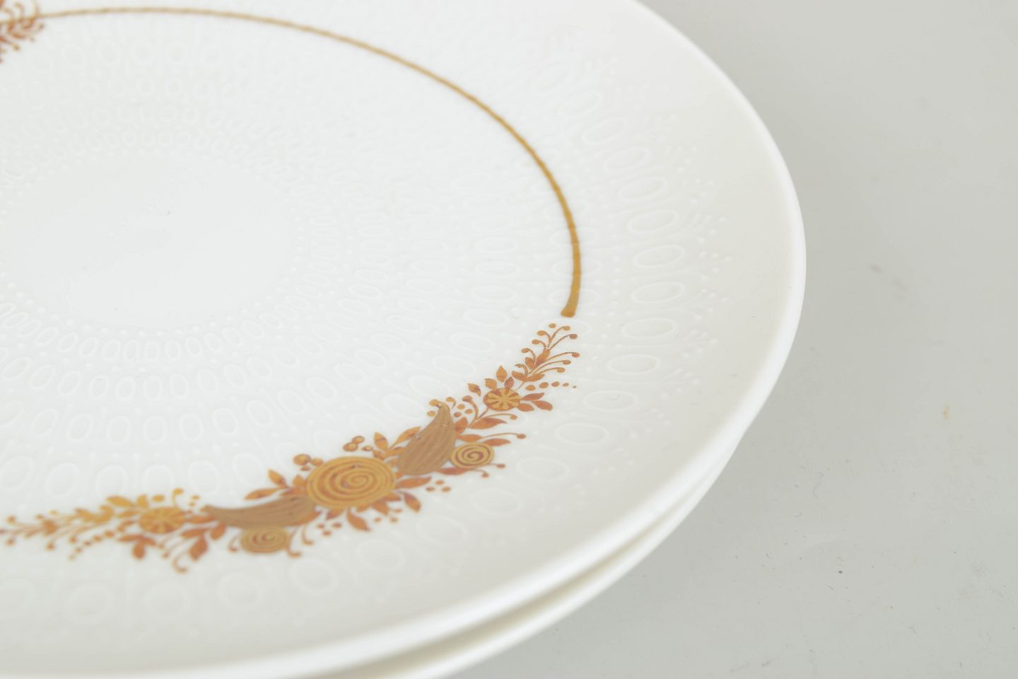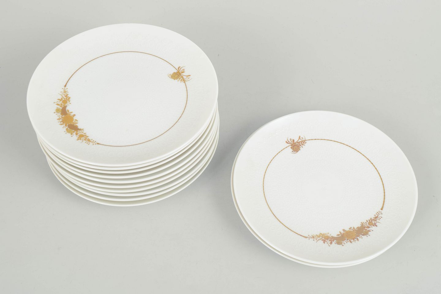 Sæt bestående af tolv kagetallerkener i porcelæn dekoreret med det karakteristiske blomsterornament fra Romanze-serien. Den fine dekoration i gyldne nuancer fremstår elegant og detaljeret med et romantisk udtryk, typisk for Wiinblads formsprog i 1970’erne.