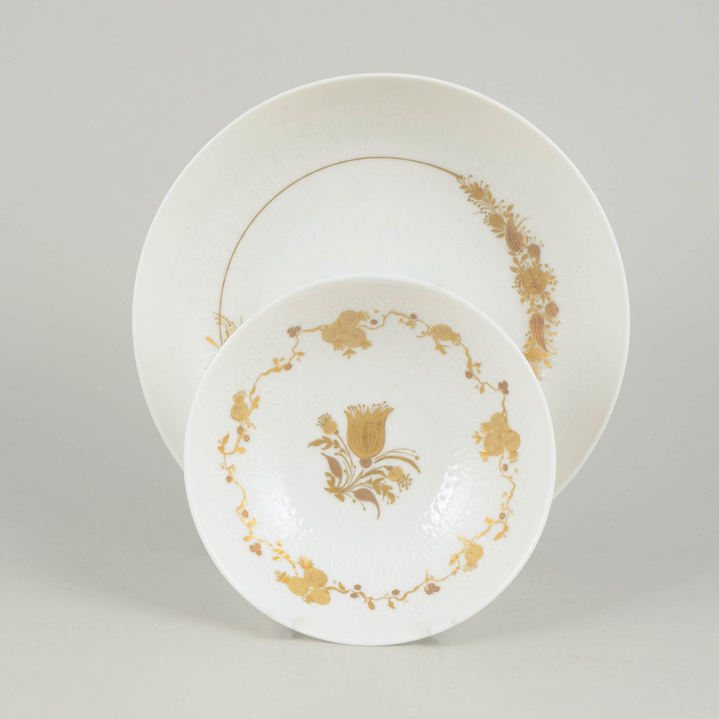 Sæt bestående af to skåle i porcelæn dekoreret med det karakteristiske blomsterornament fra Romanze-serien. Dekorationen fremstår i gyldne nuancer med fine detaljer og et elegant, romantisk udtryk, typisk for Wiinblads formsprog i 1970’erne.
