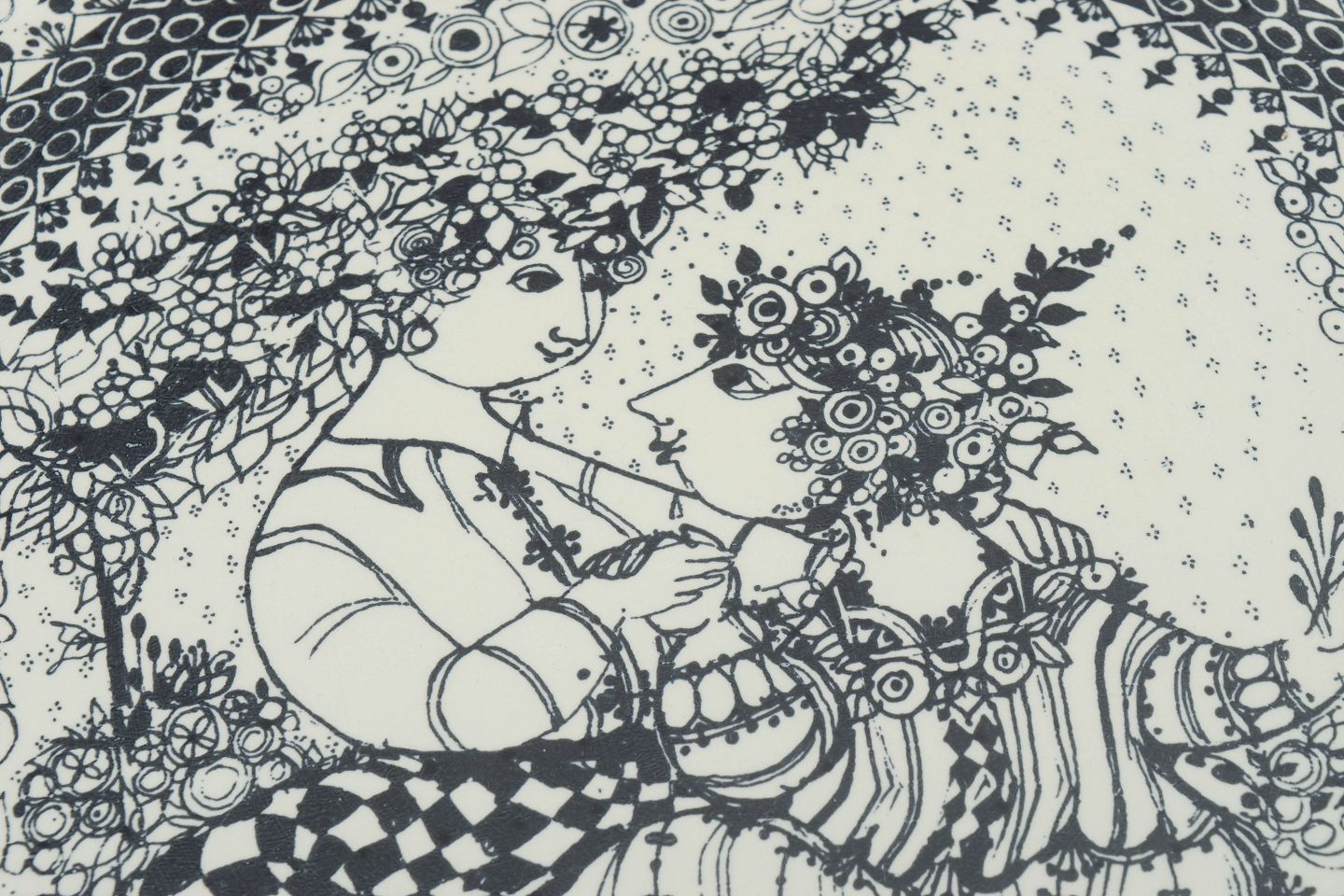 Dekorative runde fade i fajance med sort stregdekoration i Bjørn Wiinblads karakteristiske eventyrlige stil, med figurmotiver og ornamentale borter. Motiverne repræsenterer årstiderne vinter og forår.