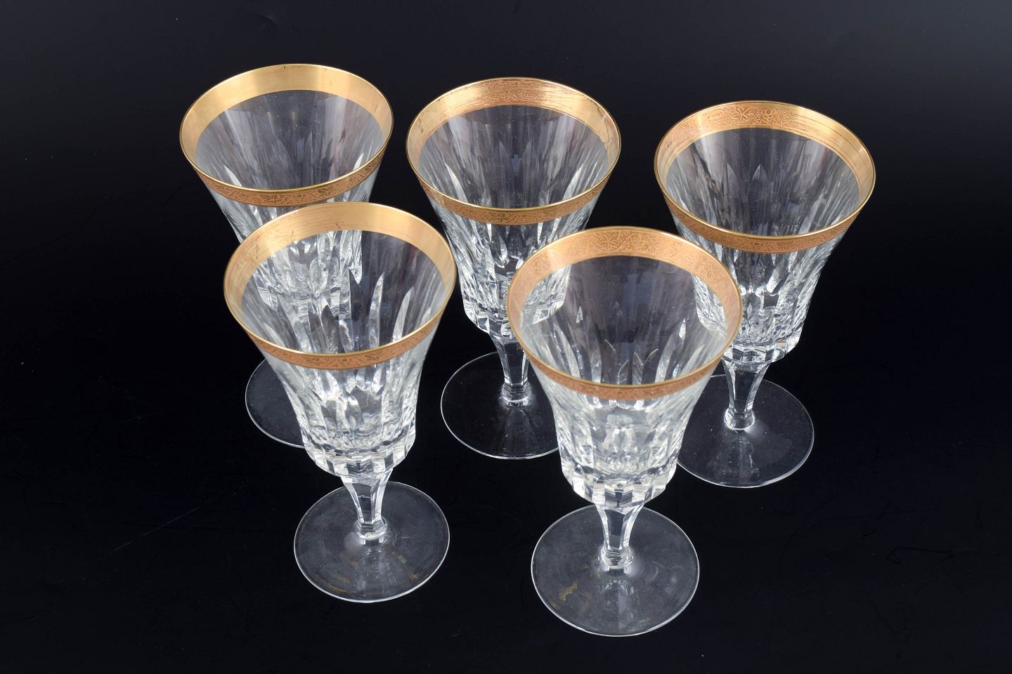 Elegant red wine glasses in cut crystal with 24 carat gold decoration along the rim, executed in a classic mid 20th century style.