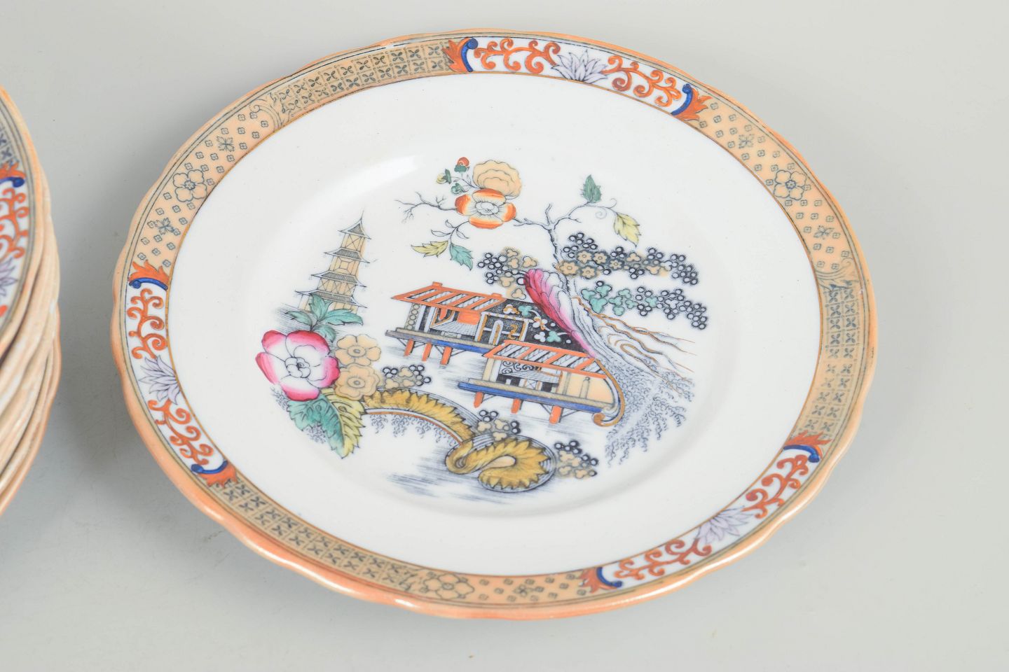 Frokosttallerkener i fajance med orientalsk inspireret dekoration i polykrome farver og detaljerig bemaling i japansk stil, karakteristisk for Rörstrands japanismeproduktion fra begyndelsen af 1900-tallet.