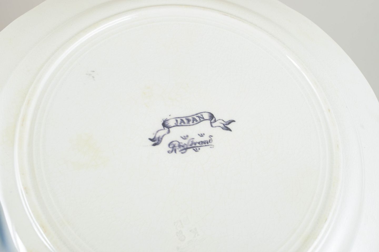 Store runde serveringsfade i fajance med orientalsk inspireret dekoration i polykrome farver og detaljerig bemaling i japansk stil, karakteristisk for Rörstrands japanismeproduktion fra begyndelsen af 1900-tallet.