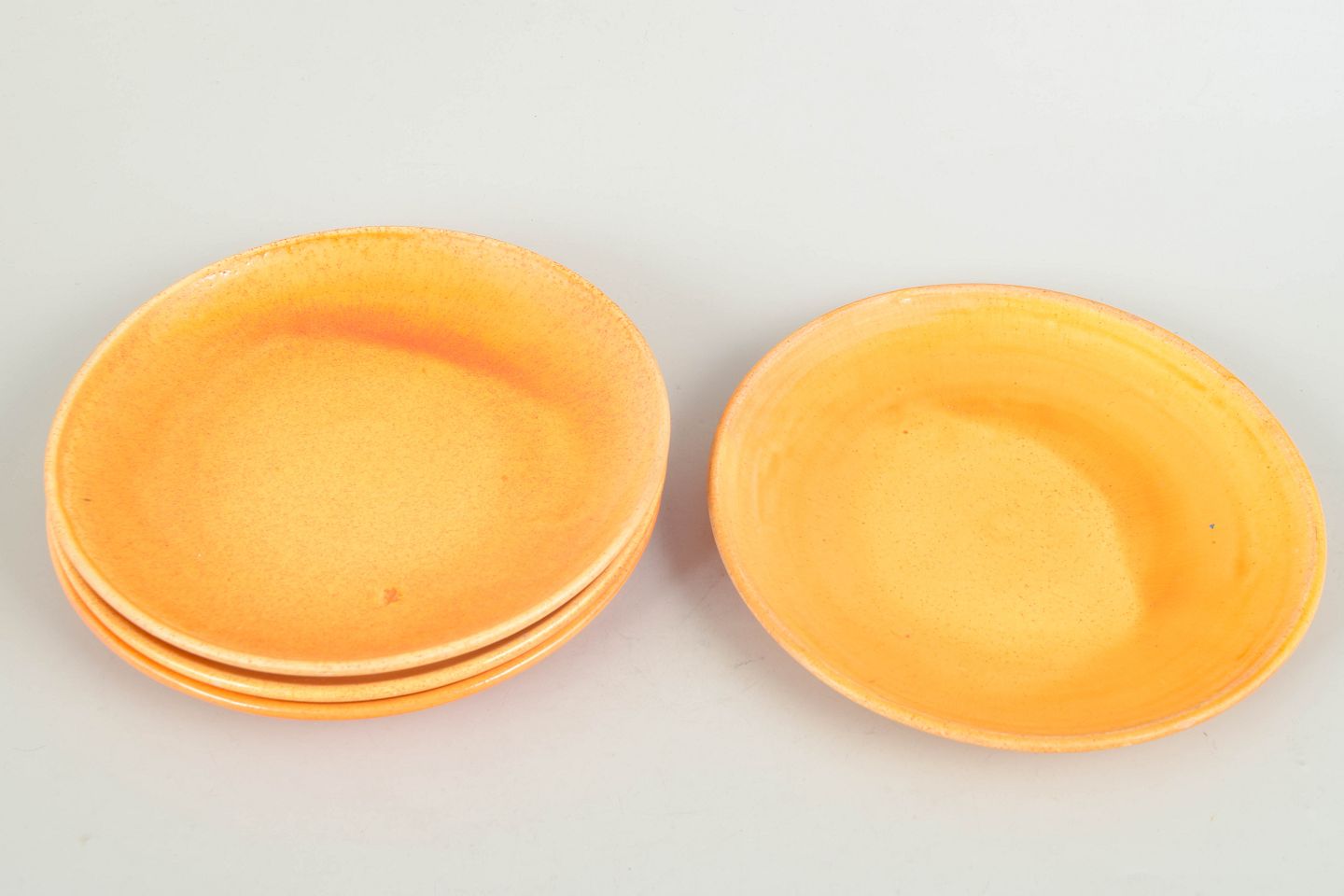 Four ceramic plates with uranium glaze in warm golden tones, produced by Kähler in the 1930s.